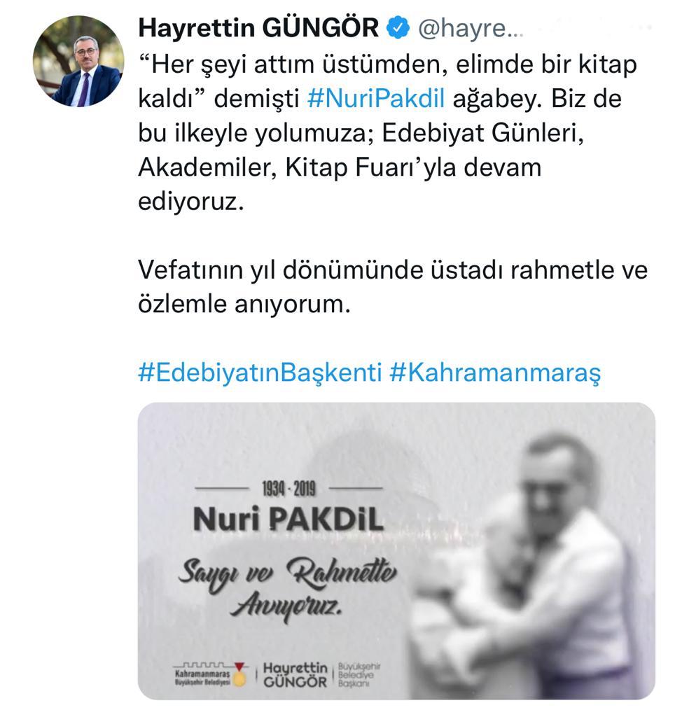 Kahramanmaraş Büyükşehir Belediye Başkanı Hayrettin Güngör, vefatının 2’inci yıldönümünde Nuri Pakdil’i anma mesajı yayımladı. Kahramanmaraş’tan yetişerek Türk edebiyatında en önemli ekollerden birini oluşturan Yedi Güzel Adam’dan biri olan Nuri Pakdil’in kitaba dair vecizelerini paylaşan Başkan Güngör, “Her şeyi attım üstümden, elimde bir kitap kaldı” satırlarını hatırlattı. Güngör, Nuri Pakdil’in Anneler ve Kudüsler eserine atıf yaptığı mesajının devamında, “Böyle demişti Nuri Pakdil ağabey. Biz de bu ilkeyle yolumuza; Edebiyat Günleri, Akademiler, Kitap Fuarı’yla devam ediyoruz. Vefatının yıl dönümünde üstadı rahmetle ve özlemle anıyorum” ifadelerini kaydetti.