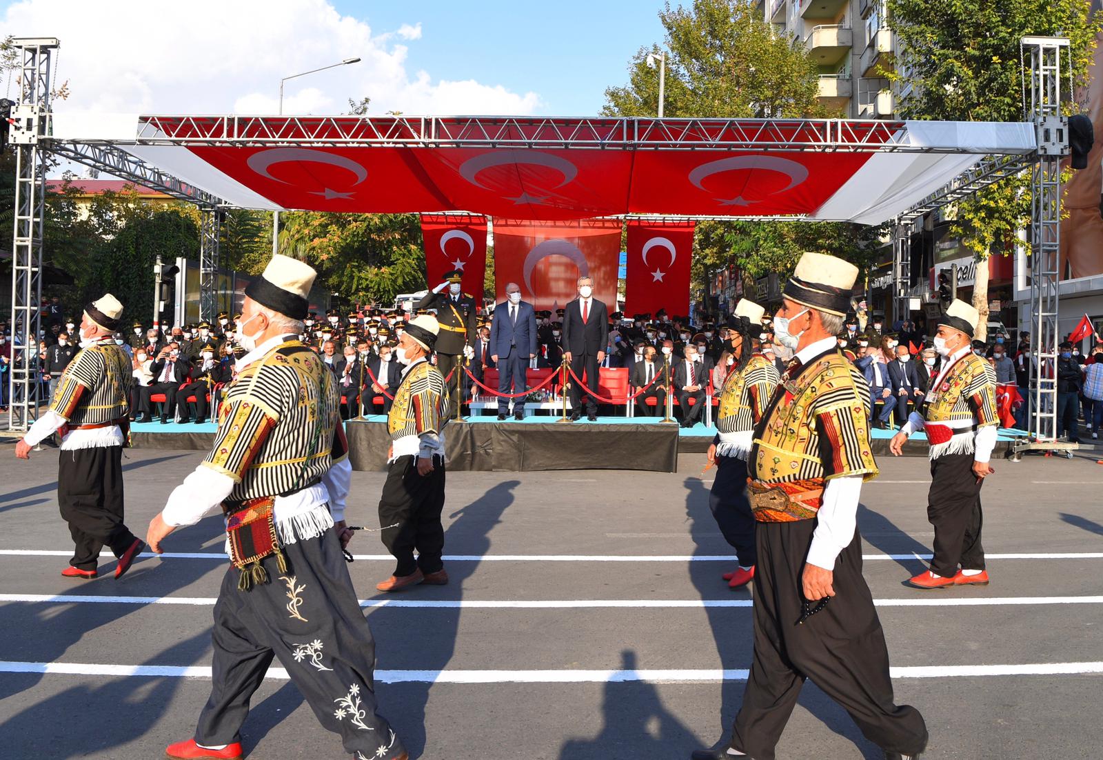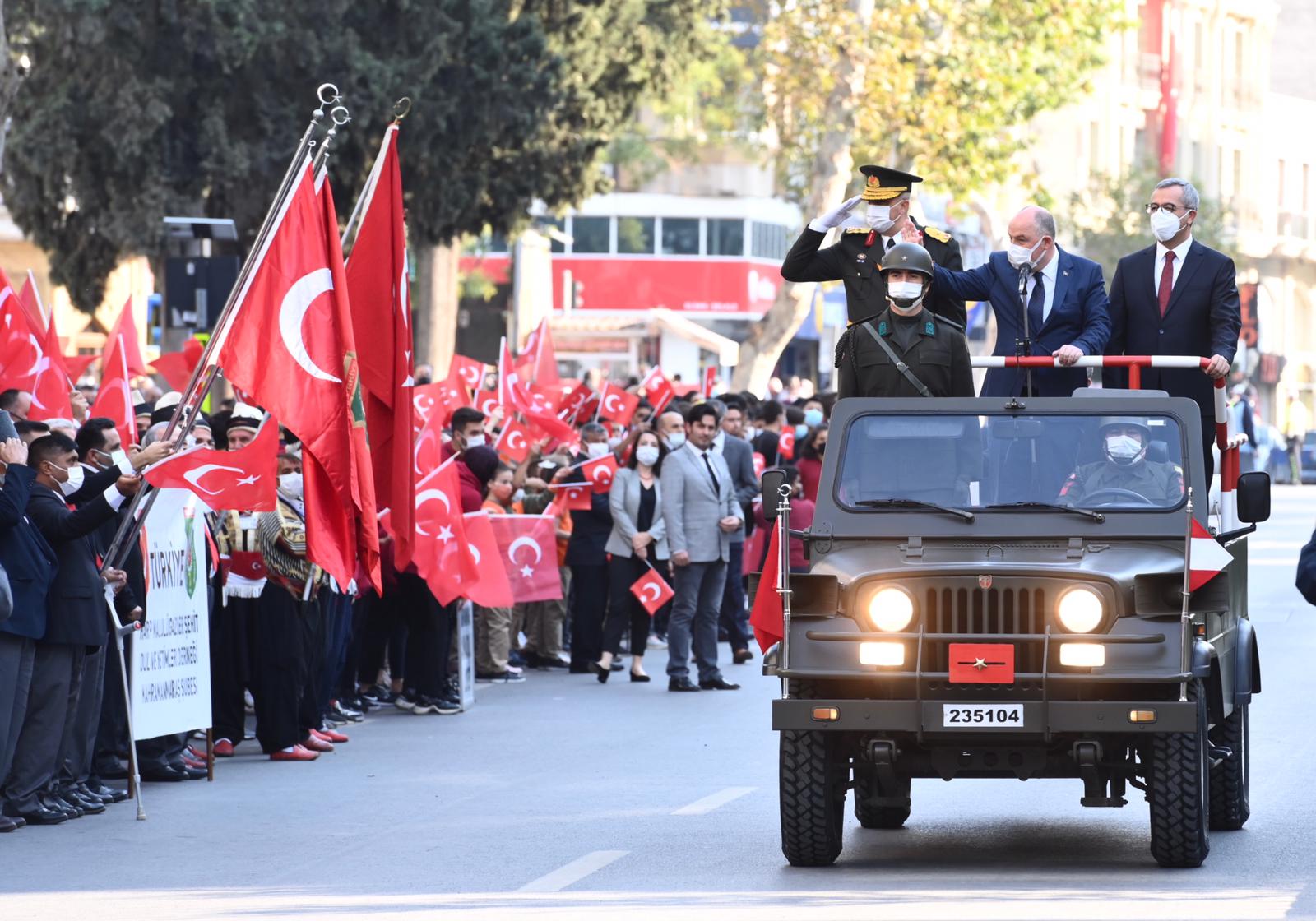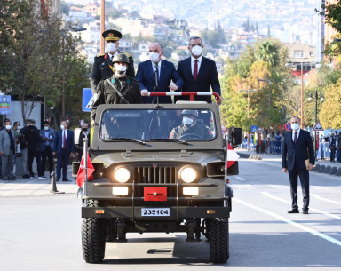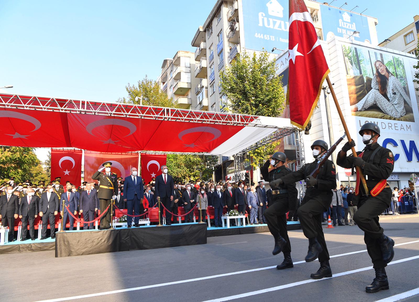 Büyükşehir Belediye Başkanı Hayrettin Güngör, “Cumhuriyetimizin 98. Yılını kahraman şehrimizde büyük bir coşkuyla kutladık. Ülkemiz hamdolsun güçlü adımlarla huzur ve refah dolu yarınlara yürüyor. Gazi Mustafa Kemal Atatürk başta olmak üzere tüm kahraman ecdadımızı rahmet ve minnetle anıyorum. Cumhuriyet Bayramımız kutlu olsun” dedi. Öğrencilerin şiirler okumasının ardından Suzan ve Abdulhakim Bilgili Halk Eğitim Merkezi’nin halk oyunları gösterisinin yapıldığı program, öğrenciler, izciler, halk oyunları ekibi, gaziler ve askeri birliklerin geçit töreni ile sona erdi.
