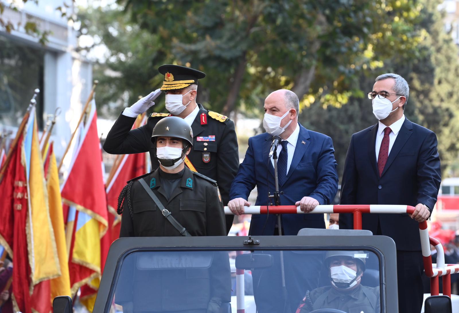 Törenin devamında konuşan Vali Ömer Faruk Coşkun, “Türkiye Cumhuriyeti’nin kuruluşunun 98. yıl dönümünde Cumhuriyet Bayramımızı millet olarak büyük bir coşku ve heyecanla kutluyoruz. Cumhuriyet; bir Milletin her türlü imkânsızlığa rağmen vatan sevgisi, hürriyet ve istiklal aşkıyla bağımsızlığına kavuşabilmek için inanç ve kararlılıkla giriştiği milli mücadelenin ardından elde etmiş olduğu büyük bir zaferin sonucudur. Atatürk’ün "En Büyük Eserim" dediği Cumhuriyetimizi ilelebet korumak, ülkemizin ve milletimizin geleceği için çalışmak, mücadele etmek, gerektiğinde fedakârlıkta bulunmak, hepimizin müşterek vazifesidir” ifadelerini kullandı.