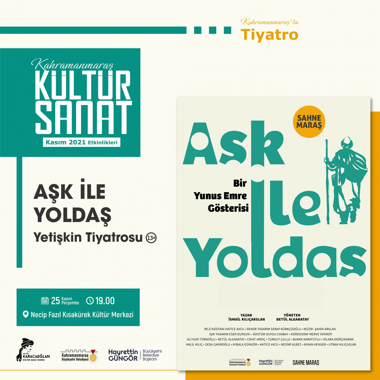 25 Kasım Perşembe / 19.00 – Necip Fazıl Kısakürek Kültür Merkezi – Sahne Maraş Tiyatro Okulu (Aşk İle Yoldaş – Yetişkin Oyunu)
