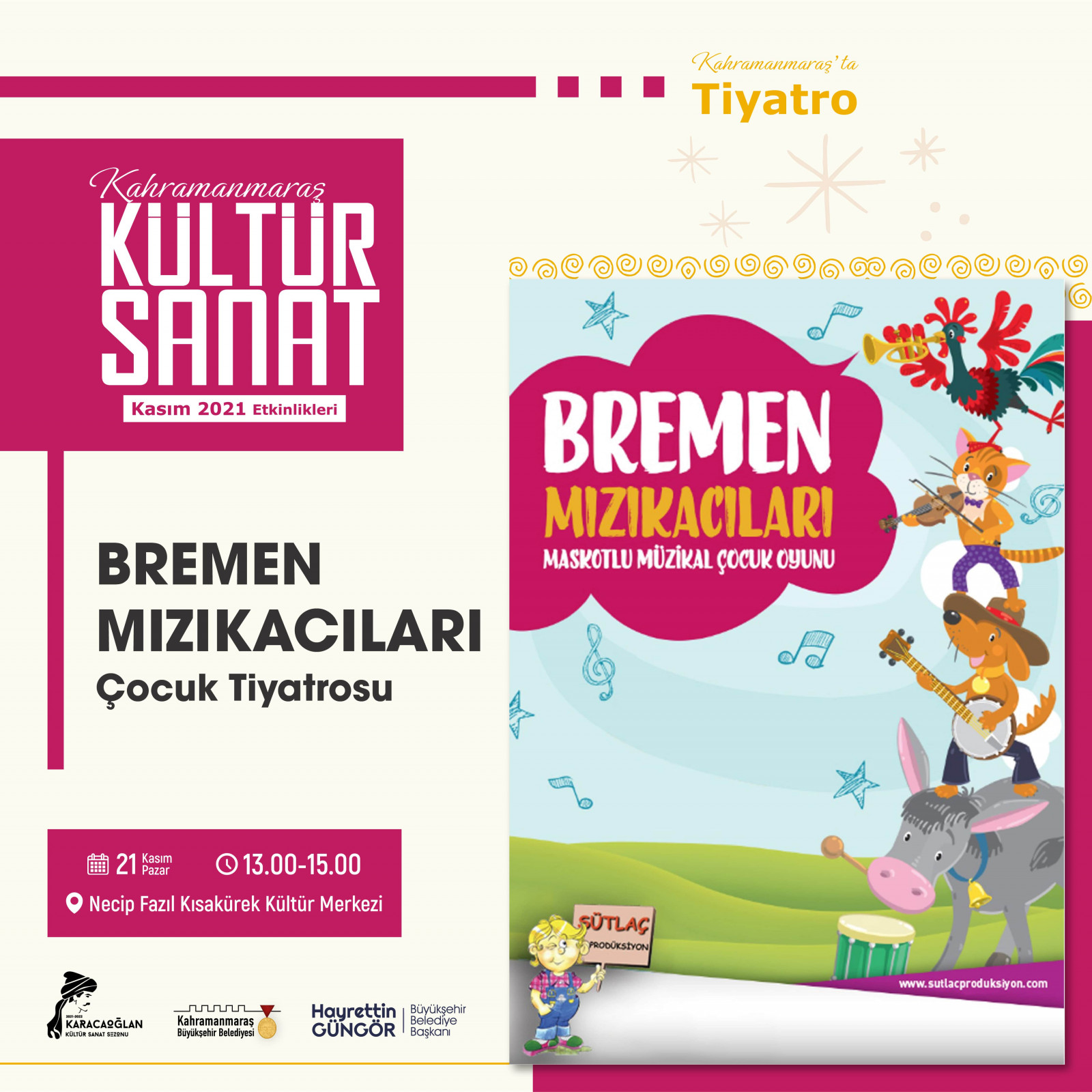 21 Kasım Pazar / 13.00 / 15.00 (2 Seans) – Necip Fazıl Kısakürek Kültür Merkezi – Bremen Mızıkacıları (Maskotlu Müzikal Çocuk Oyunu)