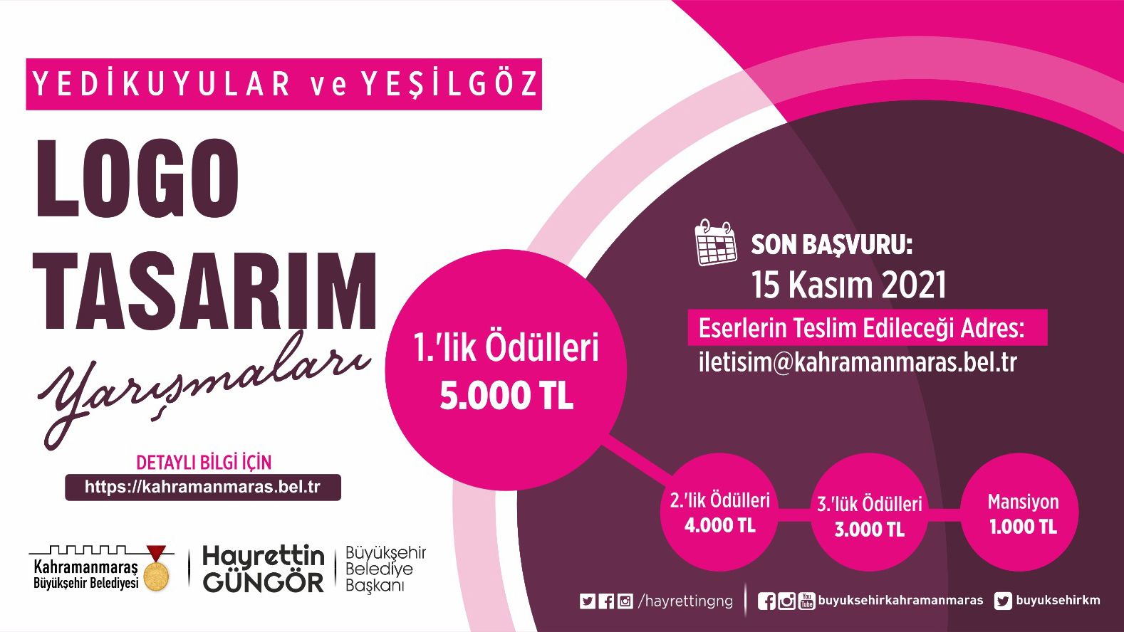 Kahramanmaraş Büyükşehir Belediyesi’nin düzenlediği ödüllü logo tasarım yarışması başvuruları devam ediyor. Şehrin iki önemli turizm değeri Yedikuyular Kayak Merkezi ve Yeşilgöz Mesire Alanı’na yönelik olarak düzenlenen yarışmalarda son başvuru tarihi 15 Kasım Pazartesi tarihine kadar uzatıldı. Her iki turizm tesisi için de hazırlanabilecek logolarda birinciler 5 bin TL, ikinciler 4 bin TL ve üçüncüler ise 3 bin TL ile ödüllendirilecek. Mansiyon ödüllerinin de 1.000 TL olarak belirlendiği yarışmalarla ilgili detaylı bilgiler Büyükşehir Belediyesi internet sitesinde yer alıyor https://kahramanmaras.bel.tr/duyuru/2021/10/28/odullu-yedikuyular-ve-yesilgoz-logo-tasarim-yarismasi