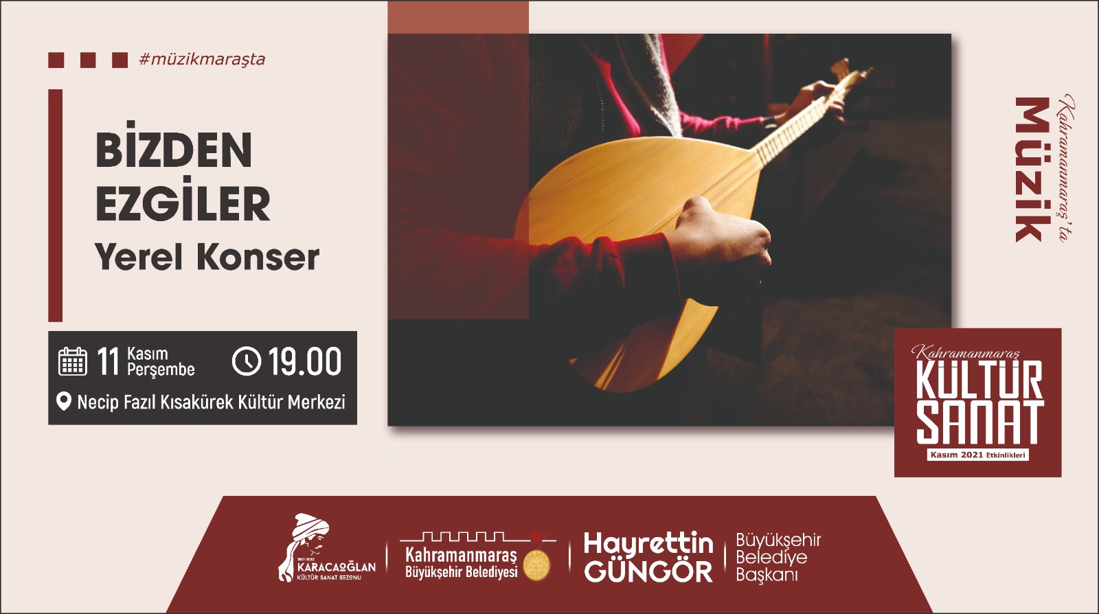 Kahramanmaraş Büyükşehir Belediyesi tarafından düzenlenen Karacaoğlan Kültür Sanat Sezonu Kasım Etkinlikleri tüm hızıyla sürüyor. Kasım ayı boyunca kadar birbirinden renkli 13 etkinliğin sanatseverlerle buluşacağı takvim kapsamında 11 Kasım Perşembe günü (yarın) saat 19.00’da Bizden Ezgiler konseri düzenlenecek. Necip Fazıl Kısakürek Kültür Merkezi’nde gerçekleştirilecek etkinlikte, yerel sanatçılar unutulmaz türkülerle kulakların pasını silecek. Kültür Spor ve Turizm Dairesi Başkanlığı tarafından yapılan açıklamada, düzenlenecek ücretsiz etkinliğe tüm vatandaşların davet edildiği bildirildi.