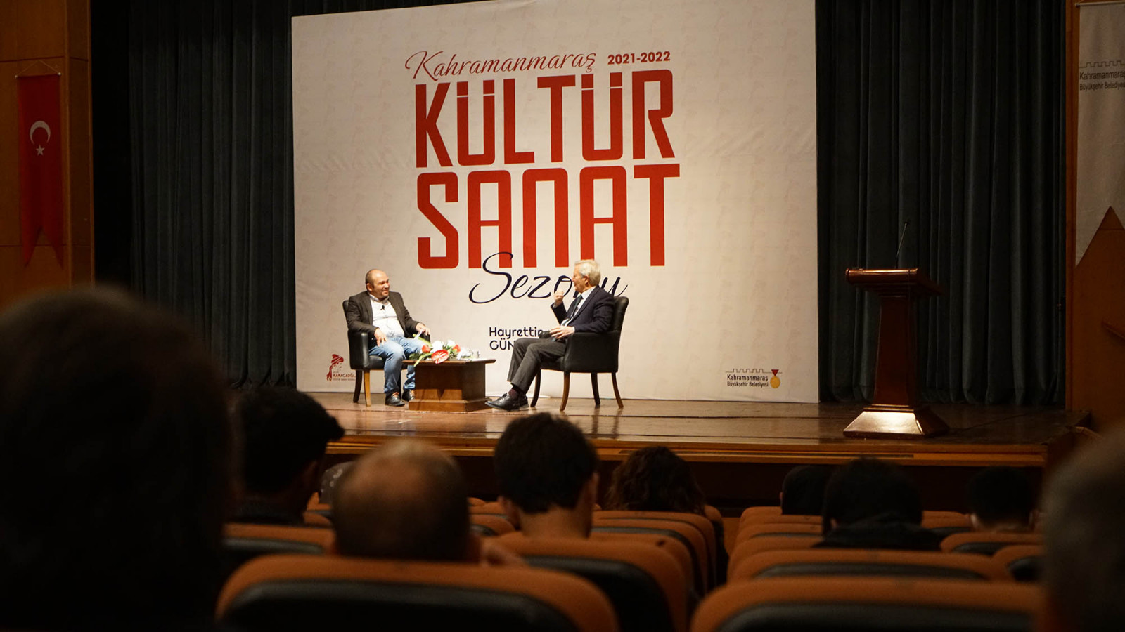 Kahramanmaraş Büyükşehir Belediyesi tarafından düzenlenen Karacaoğlan Kültür Sanat Sezonu kapsamında Beşir Ayvazoğlu ile söyleşi programı gerçekleştirildi. Necip Fazıl Kısakürek Kültür Merkezi’nde düzenlenen programın moderatörlüğünü ise Ömer Yalçınova üstlendi. Türk edebiyatına eserleriyle damga vurmuş usta kalemin yaşantısından kesitleri anlattığı programda, ilham kaynakları, düşün hayatında etkili olan eserler ve müellifleri de masaya yatırıldı. Edebiyatseverlerin de sorularıyla katkı sağladığı program sonrası okurlarının kitaplarını imzalayan Beşir Ayvazoğlu, şiir ve edebiyatın başkenti Kahramanmaraş’ta bulunmaktan duyduğu memnuniyeti ifade etti.