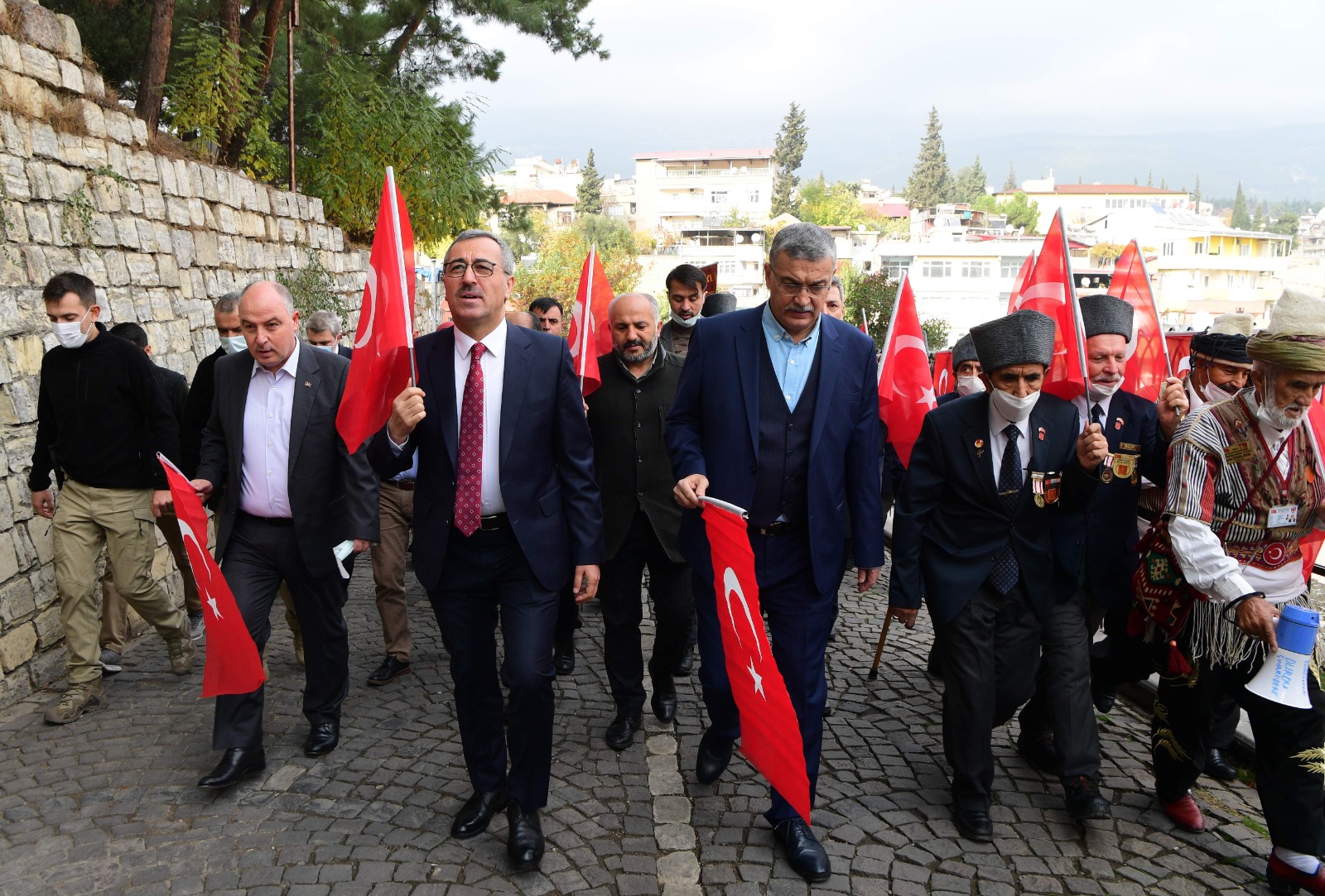 Kahramanmaraş Büyükşehir Belediye Başkanı Hayrettin Güngör, Bayrak Olayı’nın 102’nci yılı dolayısıyla tertip edilen etkinliklere katıldı. Vali Ömer Faruk Coşkun, TBMM İçişleri Komisyon Başkanı Celalettin Güvenç, Garnizon Komutanı Tuğgeneral Emin Mehmet Terzioğlu, MHP Kahramanmaraş Milletvekili Sefer Aycan, Kayseri Milletvekili Baki Ersoy, Ankara Milletvekili Nevin Taşlıçay ve protokol üyelerinin yer aldığı etkinliğe çok sayıda vatandaş da katıldı. Şeyh Adil Mezarlığı’nda Rıdvan Hoca’nın kabir ziyaretiyle başlayan program, Atatürk Meydanı’nda devam etti. Avukat Mehmet Ali Bey’in kaleme aldığı Alem-i İslam’a Hitap Beyannamesi’nin okunduğu ve temsili bir hutbe konuşmasının yapıldığı etkinliğin ardından, onlarca vatandaş bayraklarıyla Tarihi Kahramanmaraş Kalesi’ne akın etti. Türk Bayrağı’nın göndere çekildiği tarihi mekânda, Kuran-ı Kerim tilaveti ve duaların ardından konuşma yapan Büyükşehir Belediye Başkanı Hayrettin Güngör, “102 yıl önce ecdadımızın vaktine hazır olarak bize gururla yaşattığı Bayrak Olayı’nı, yeniden aynı heyecanla hissediyoruz” diye konuştu.