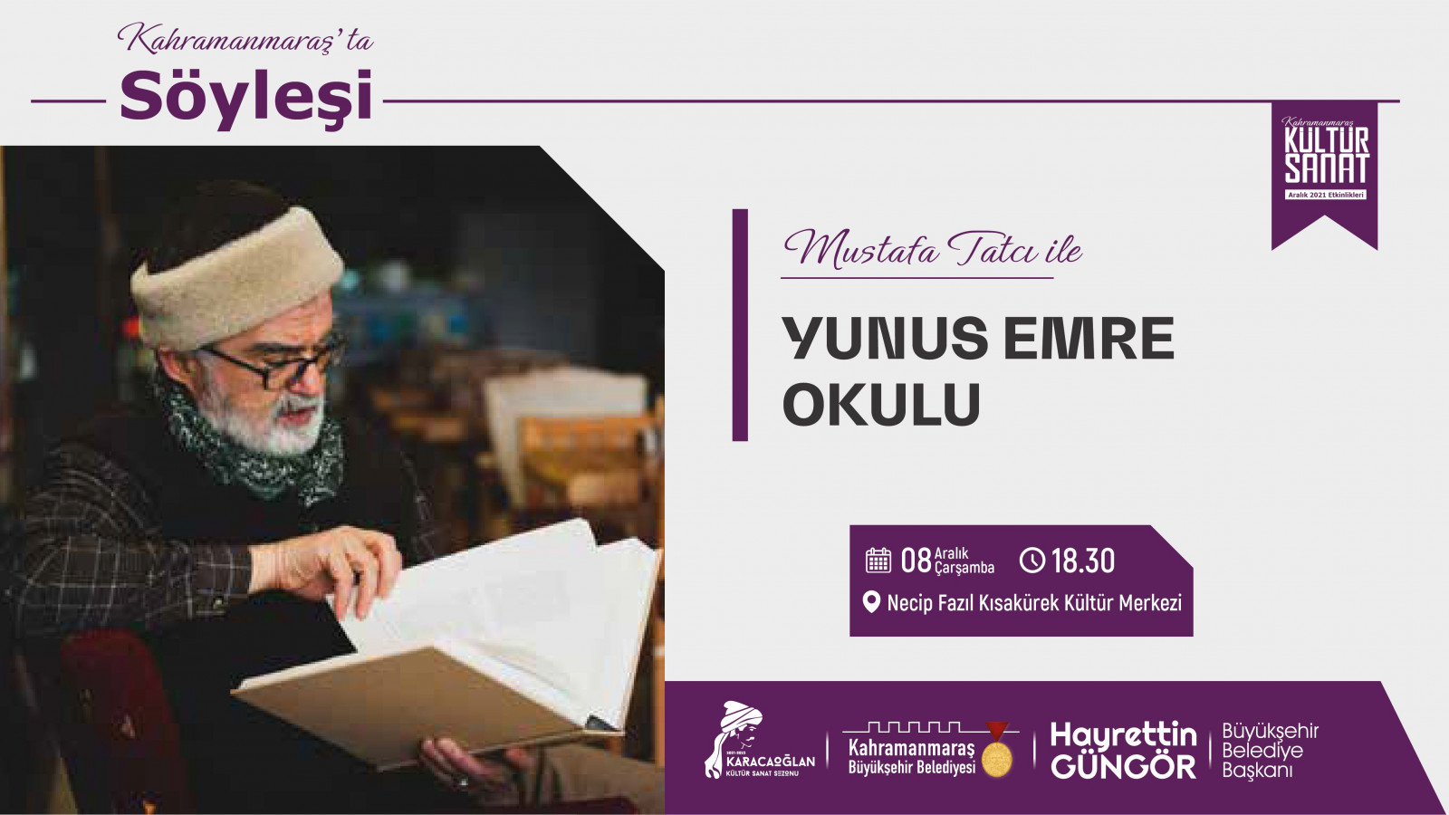 Kahramanmaraş Büyükşehir Belediyesi Aralık Kültür Sanat Etkinlikleri devam ediyor. Ayın sonuna kadar birbirinden renkli etkinliklerle sanatseverleri buluşturacak takvim kapsamında usta yazar Mustafa Tatçı ile söyleşi düzenlenecek. Necip Fazıl Kısakürek Kültür Merkezi’nde 8 Aralık Çarşamba günü saat 18.30’da gerçekleştirilecek etkinlik, Yunus Emre konuşulacak. Kültür Spor ve Turizm Daire Başkanlığı’ndan yapılan açıklamada, tüm vatandaşların programa davet edildiği bildirildi.