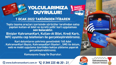 Kahramanmaraş Büyükşehir Belediyesi, 1 Ocak 2022 tarihi itibariyle toplu taşıma araç içinde satılan “Kullan-At Bilet” ve kullanılan “Şoför Kart” uygulamaları rafa kaldırıyor. İlgili tarihte şehir genelindeki 480 toplu taşıma aracında iki ödeme yöntemi yerine, temassız kredi kartları ve cep telefonları kullanılabilecek. Ayrıca; Kahramankart bakiye yüklemeleri cep telefonlarından kısa mesajla, internet üzerinden, online yükleme, KİOSK’lar (Kahramankart Dolum Makineleri) ya da bayiler aracılığıyla yapılmaya devam edecek. Temassız ödemeye açık kart ve cihazlardan NFC teknolojisiyle yapılabilecek ödemeler, tüm Özel Halk ve Belediye otobüslerinde geçerli olacak. Ulaşım Hizmetleri Daire Başkanlığı’ndan yapılan açıklamada, detaylı bilginin 0344 225 46 20 – 21 çağrı hattından ve www.kahramankart.com.tr internet adresinden alınabileceği ifade edildi.