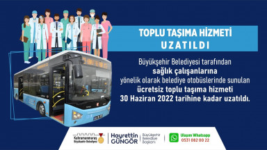 Büyükşehir Belediyesi tarafından sağlık çalışanlarına yönelik olarak belediye otobüslerinde sunulan ücretsiz toplu taşıma hizmeti 30 Haziran 2022 tarihine kadar uzatıldı.