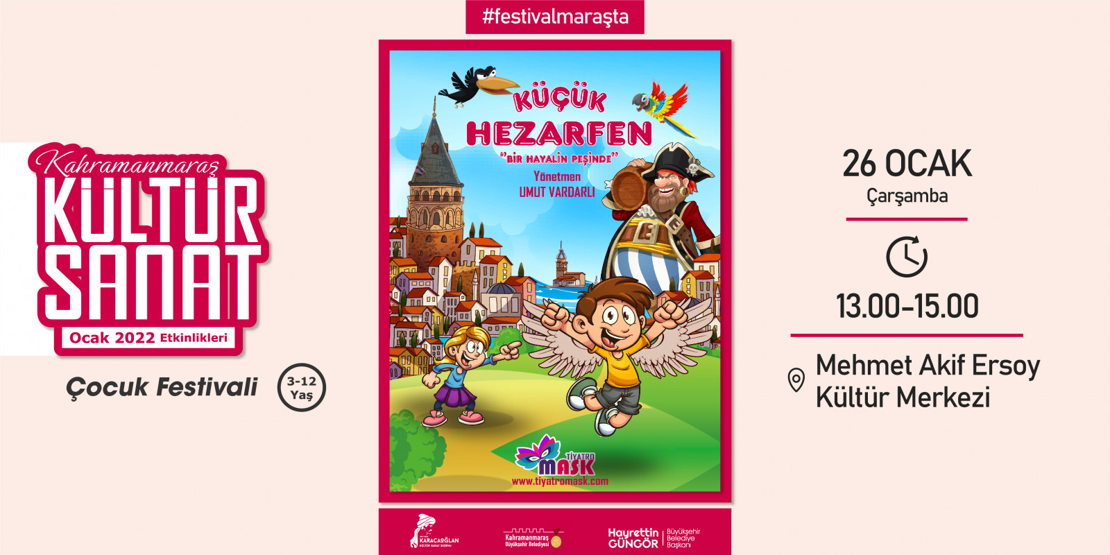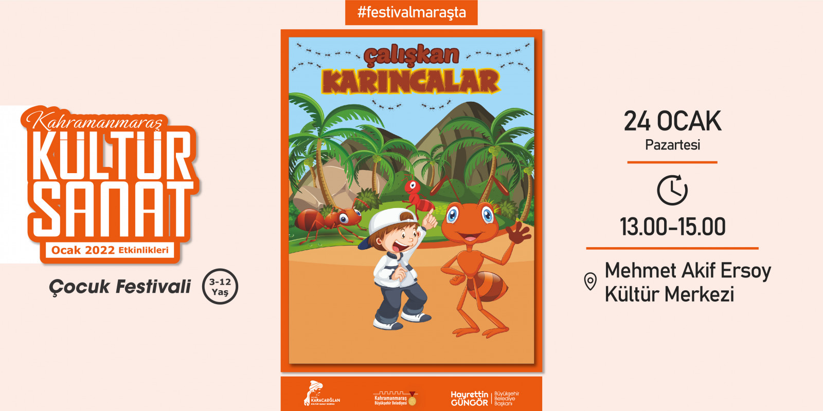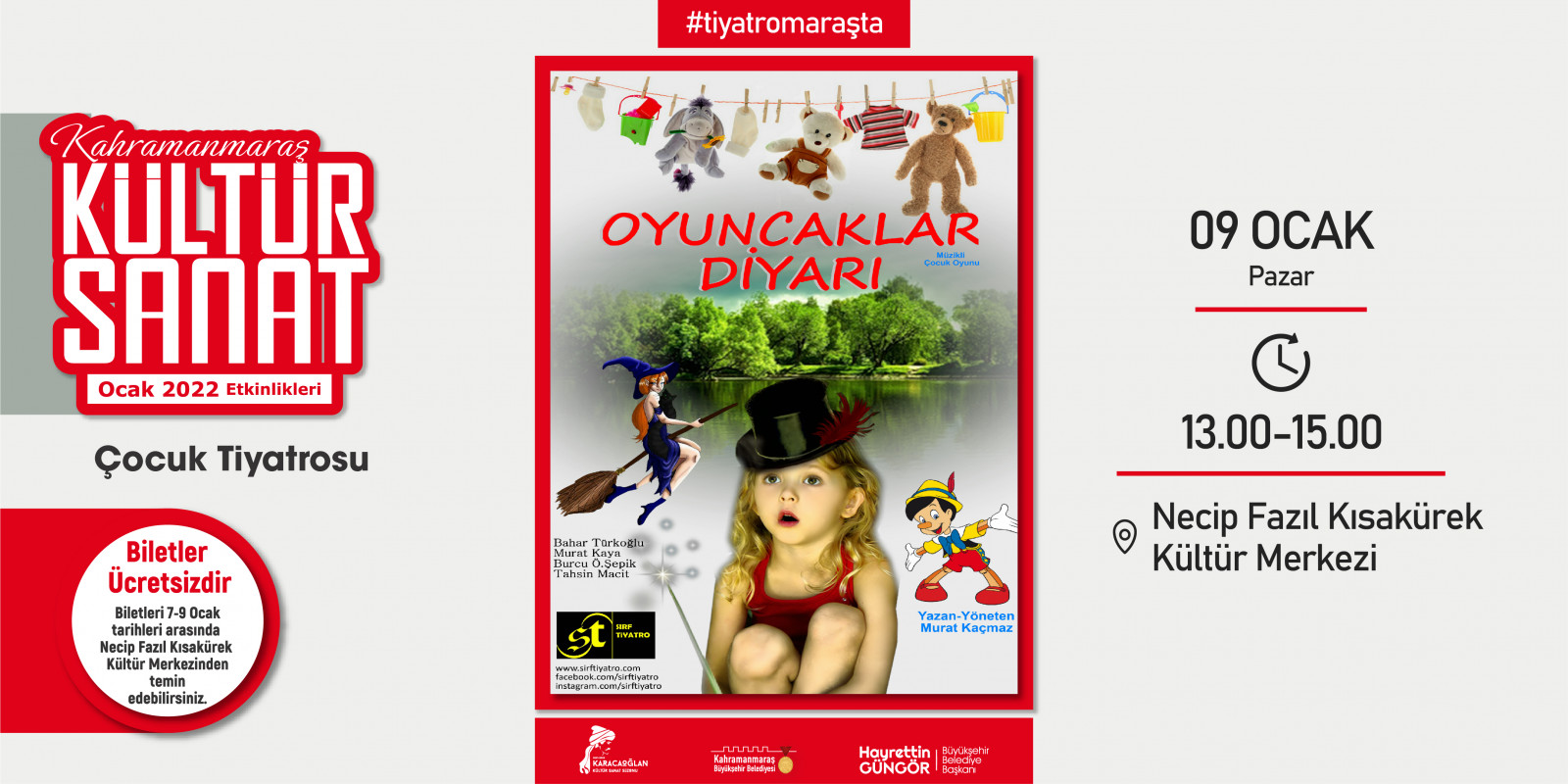Kahramanmaraş Büyükşehir Belediyesi tarafından geleneksel hale getirilen “Kültür Sanat Sezonu” etkinlikleri Ocak ayında da devam ediyor. 2 – 30 Ocak tarihleri arasında sergiden konserlere, söyleşilerden tiyatrolara kadar toplam 17 etkinlik edebiyatın başkenti Kahramanmaraş’ta sanatseverlerle buluşacak. Takvim kapsamında; Haadi Mousavi ve Şahin Aslan’ın objektifinden çıkan “Elimin Emeği” adlı sergi ziyaretçilerine kapılarını açarken, “Çırpınırdı Karadeniz” eserinin güçlü sesi Azerin konseri kulakların pasını silecek. Minik izleyicileri de etkinliklerde özel bir hafta bekliyor; 5 gün boyunca birbirinden eğlenceli 5 tiyatro gösterisi “Çocuk Festivali” kapsamında sahne alacak. Ocak Kültür Sanat Sezonu etkinlik takvimine https://kahramanmaras.bel.tr/duyuru/2021/11/01/ocak-ayi-kultur-sanat-sezonu-etkinlik-takvimi adresinden ulaşılabiliyor.