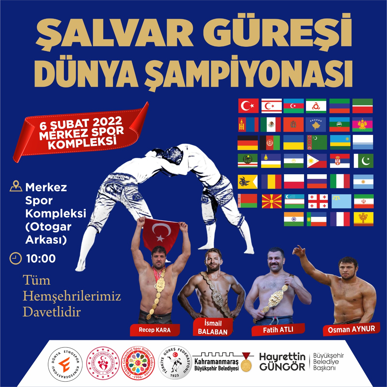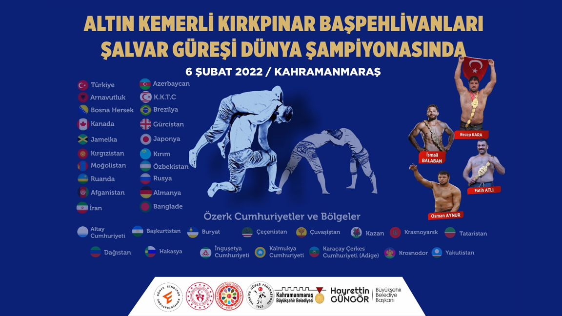Kahramanmaraş Büyükşehir Belediyesi, uluslararası bir spor etkinliğine daha ev sahipliği yapmaya hazırlanıyor. Dünya Etnospor Konfederasyonu ve Türkiye Geleneksel Spor Dalları Federasyonu koordinasyonunda 6 Şubat Pazar günü kentte Şalvar Güreşi Dünya Şampiyonası düzenlenecek. Merkez Spor Kompleksi’nde saat 10.00’da start alacak şampiyonaya; Arnavutluk, Bosna Hersek, Kanada, Jamaika, Kırgızistan, Moğolistan, Ruanda, Afganistan, İran, Azerbaycan, Rusya, Japonya, Almanya, KKTC, Brezilya, Gürcistan, Özbekistan, Bangladeş ile özerk cumhuriyetler ve bölgeler dahil olmak üzere 40 farklı ülkeden 300 sporcu katılacak.