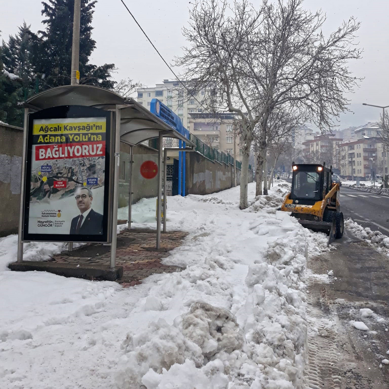 Kahramanmaraş Büyükşehir Belediyesi, kış şartlarıyla mücadele kapsamında 220 araç ve 600’ün üzerinde personelle çalışmalarını aralıksız sürdürüyor. Şehrin yüksek kesimlerinde ana arterlerde, bulvarlarda ve kavşaklarda kar küreme çalışmalarını hız kesmeden sürdüren ekipler, diğer taraftan fırtına sonucu yaya geçitleri, orta refüjler, ve otobüs durakları gibi muhtelif yerlere savurulan çeşitli türden nesneleri bulunduğu yerden kaldırarak ulaşımda oluşabilecek aksamaları engellemeyi hedefliyor. Ayrıca ekipler, ana arterlerde, üst geçitlerde, otobüs durakları ve yürüyüş yollarında oluşabilecek don ve buzlanmanın önüne geçmek için şehir genelinde kazıma, tuzlama ve solüsyon uygulamalarını sürdürüyor.