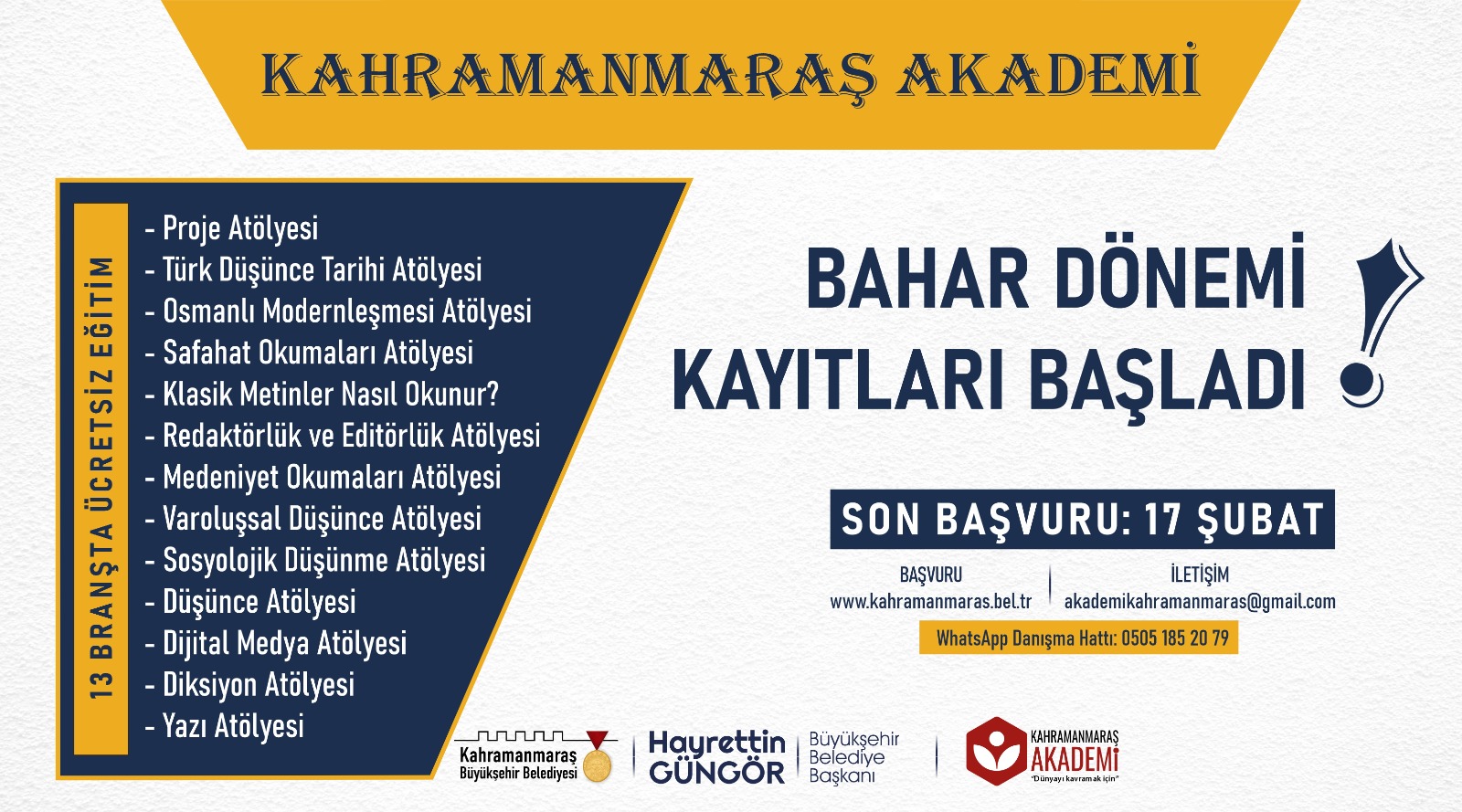 Kahramanmaraş Büyükşehir Belediyesi tarafından düzenlenen ‘Kahramanmaraş Akademi’ de bahar dönemi başvuruları başladı. 13 atölyede ücretsiz verilecek eğitimler için Büyükşehir Belediyesi internet sitesi üzerinden alınan başvurularda son gün 17 Şubat Perşembe.