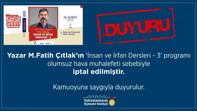 Kahramanmaraş Büyükşehir Belediyesi, Şubat Kültür Sanat Etkinlikleri kapsamında 24 Şubat Perşembe günü (bugün) saat 18.00’da Necip Fazıl Kısakürek Kültür Merkezi’nde düzenlenmesi planlanan İlahiyatçı – Yazar M. Fatih Çıtlak konferansının olumsuz hava koşulları nedeniyle ileri bir tarihe ertelendiğini duyurdu. Kültür Spor ve Turizm Dairesi Başkanlığı’ndan ertelenen etkinliğe ilişkin yapılan açıklamada, “Yaşanan hava muhalefeti nedeniyle bugün saat 18.00’da düzenlenmesi planlanan Yazar Fatih Çıtlak konferansı ileri bir tarihte gerçekleştirilmek üzere iptal olmuştur” ifadelerine yer verildi.