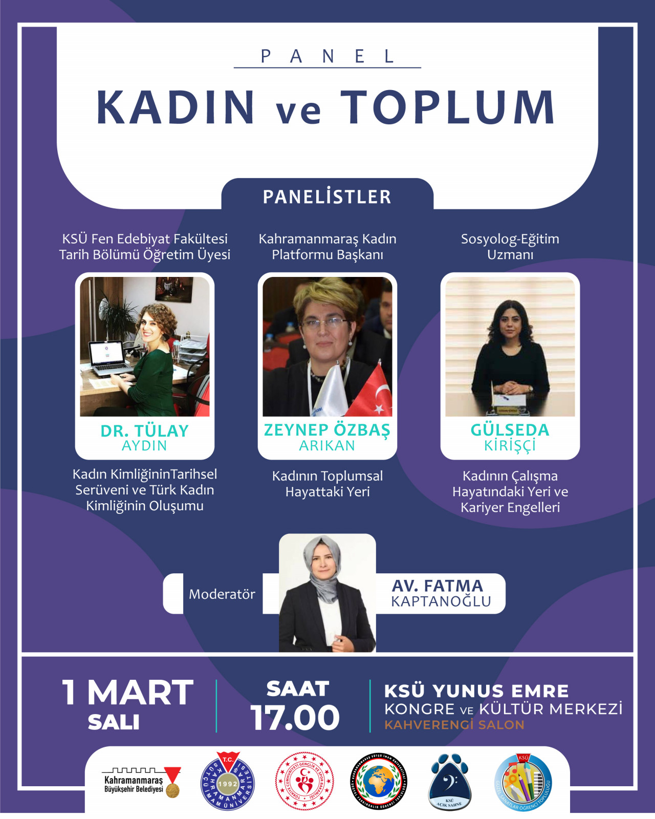 Kahramanmaraş Büyükşehir Belediyesi tarafından 8 Mart Dünya Kadınlar Günü dolayısıyla bir dizi etkinlik düzenlenecek. Bu kapsamda, Sütçü İmam Üniversitesi iş birliğiyle 1 Mart Salı günü (bugün) saat 17.00’da ‘Kadın ve Toplum’ adlı panel gerçekleştirilecek. Moderatörlüğünü Avukat Fatma Kaptanoğlu’nun üstleneceği etkinliğin konukları arasında Kahramanmaraş Kadın Platformu Başkanı Zeynep Özbaş Arıkan, KSÜ Fen Edebiyat Fakültesi Tarih Bölümü Öğretim Üyesi Dr. Tülay Aydın ve Sosyolog – Eğitim Uzmanı Gülseda Kirişçi yer alıyor.