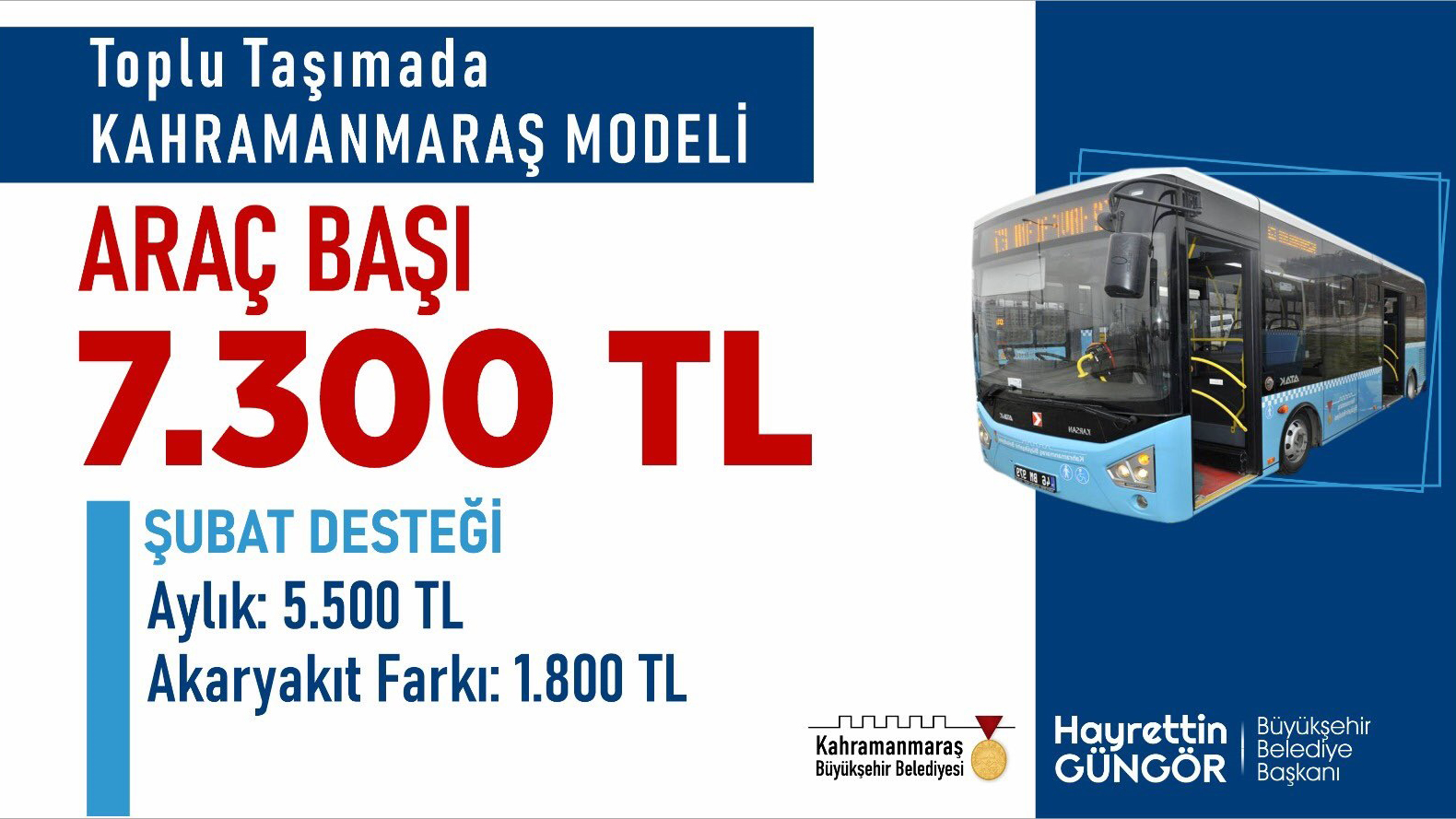 Büyükşehir Belediyesi tarafından toplu taşıma esnafına sağlanan aylık desteklerin yanı sıra mazot fiyat farkı ödemesi de gerçekleştiriliyor. Bu kapsamda Şubat ayı aylık ödeme desteğinin 7 bin 300 TL’ye ulaştığını belirten Başkan Güngör, “Toplu taşımda Kahramanmaraş Modeli var. Şubat ayı desteğimiz, mazot fiyat farkı ödemesiyle araç başı 7 bin 300 TL oldu. Hayırlı olsun” dedi.
