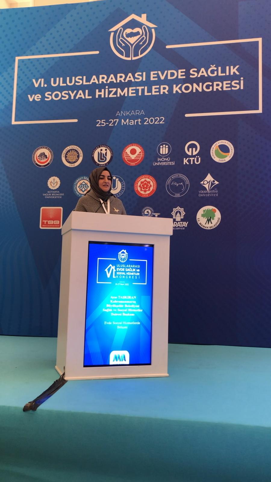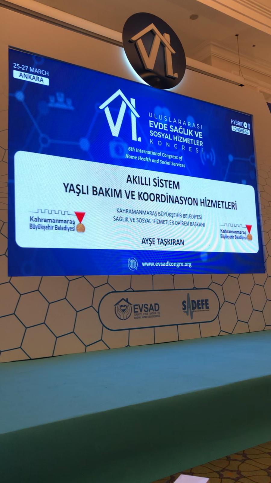 Kahramanmaraş Büyükşehir Belediyesi tarafından yaşlı vatandaşlara yönelik düzenlenen faaliyetler ve yaşlıların evlerine kurulan akıllı sistemler Ankara’da düzenlenen 6. Uluslararası Evde Sağlık ve Sosyal Hizmetler Kongresi’nde anlatıldı. Sağlık Bakanlığı ve Aile ve Sosyal Hizmetler Bakanlığı iş birliğiyle evde sağlık, sosyal destek ve bakım hizmetleri alanında tüm paydaşların katılımıyla gerçekleştirilen kongrede Büyükşehir Belediyesi adına Sağlık ve Sosyal Hizmetler Dairesi Başkanı Ayşe Taşkıran sunum yaptı. Kahramanmaraş Büyükşehir Belediyesi’nin yaşlı vatandaşlara yönelik uygulamalarından duyduğu memnuniyeti ifade eden Engelli ve Yaşlı Hizmetleri Genel Müdürü Opr. Dr. Orhan Koç, bu alanda diğer belediyelere öncülük ettiği için Kahramanmaraş Büyükşehir Belediyesi’ne teşekkür etti.