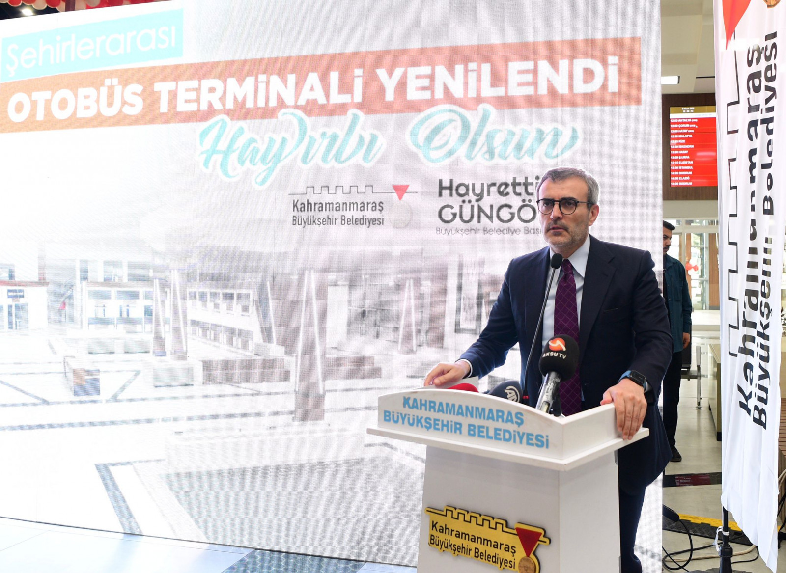 AK Parti Grup Başkan Vekili Mahir Ünal ise, “Kahramanmaraş’ımız konum itibariyle çok önemli bir noktada yer alıyor. Ayrıca Sayın Cumhurbaşkanımızın liderliğinde yapmış olduğumuz yatırımlarla şehrimizin çevre illerle hiçbir ulaşım problemi kalmamıştır. Özellikle Göksun – Kahramanmaraş arasında kazandırılan tüneller ve viyadükler şehrimizin erişilebilirliğini kat be kat artırmıştır. Bu noktada Büyükşehir Belediyemiz de elinden gelen gayreti göstermiştir. Biraz önce şehrimize yeni kazandırılan hizmet araçlarının teslim törenini gerçekleştirdik. Şimdi de baştan uca yenilenen Şehirlerarası Otobüs Terminalimizin açılışını gerçekleştiriyoruz. Bu yatırımların Büyükşehir Belediyesi’ne maliyeti yaklaşık 66 Milyon TL. Şehrimize yapmış olduğu hizmetlerden dolayı Büyükşehir Belediye Başkanımız Hayrettin Güngör’e de teşekkür ediyorum” dedi. Gerçekleştirilen protokol konuşmalarının ardından kurdele kesimi yapılarak Şehirlerarası Otobüs Terminali’nin açılışı gerçekleştirildi.
