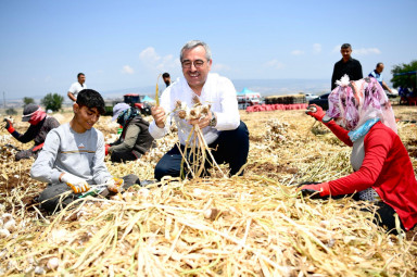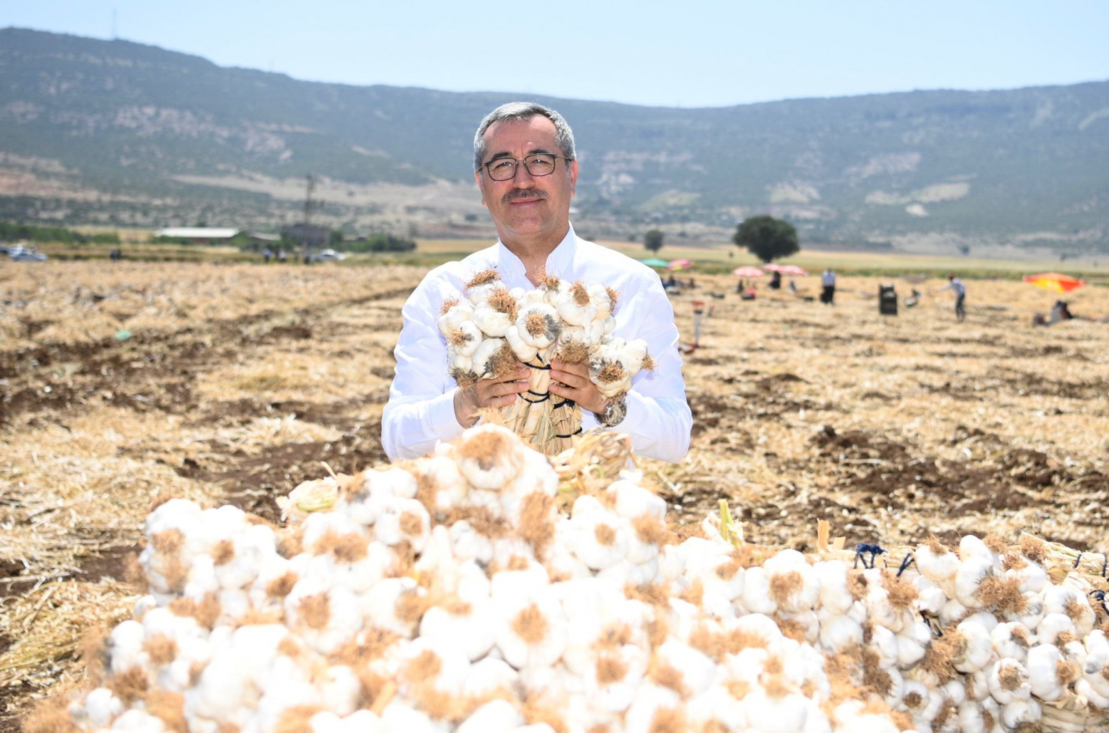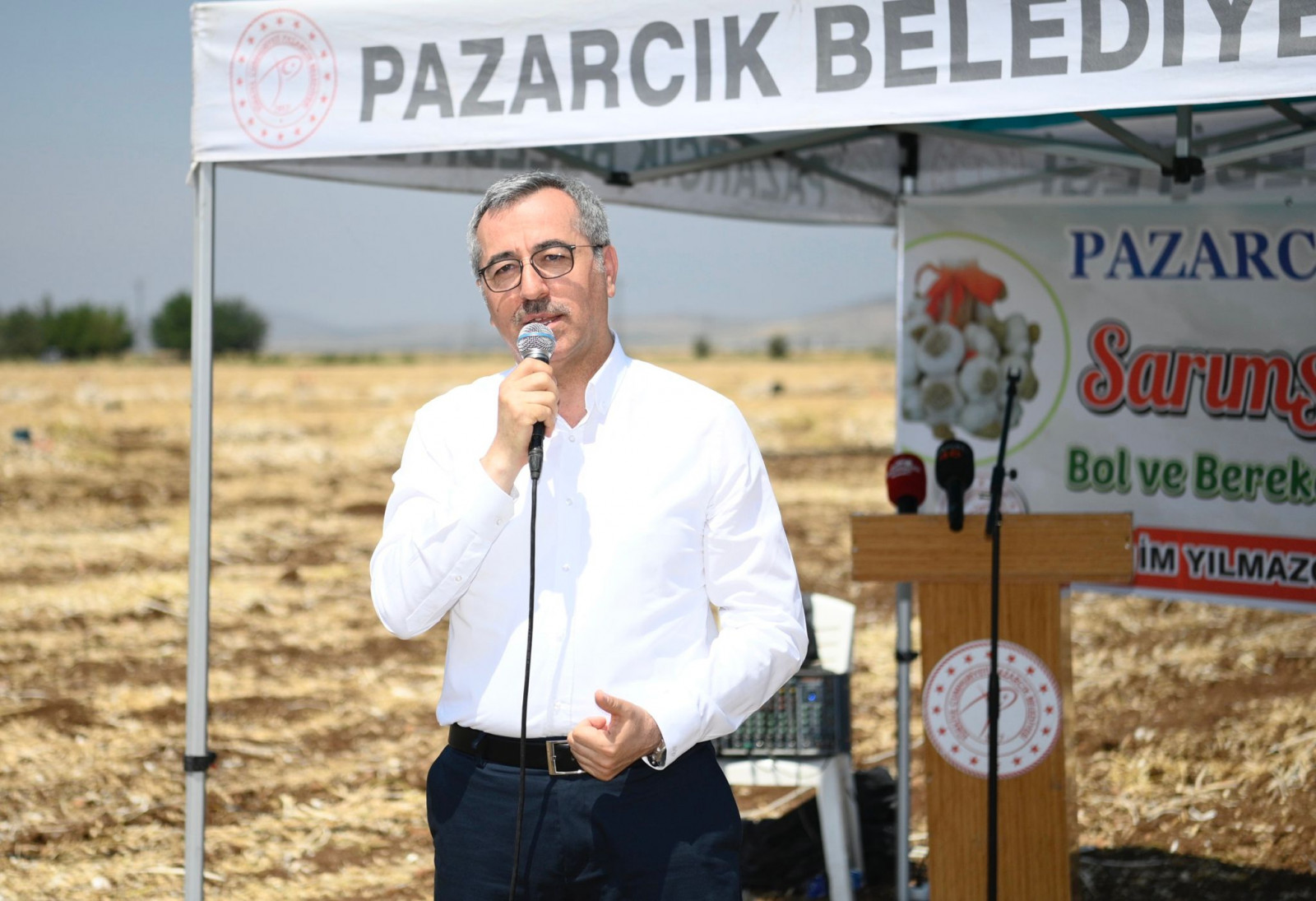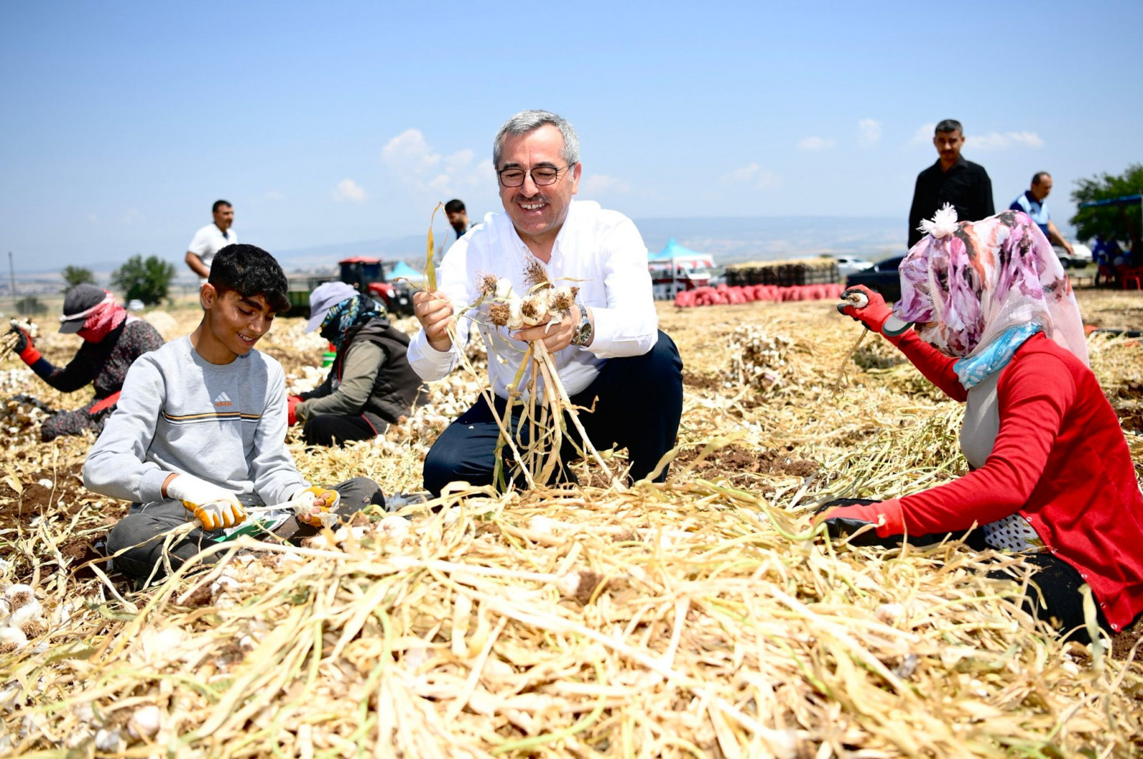Pazarcık Beşçeşme’de sarımsak hasadına katılan Başkan Hayrettin Güngör, “Kahraman şehrimiz coğrafyası, iklimi, birçok coğrafi bölgede toprağının olmasıyla çok fazla tarım ürününe ev sahipliği yapıyor. Sarımsak üretiminde Türkiye’de üçüncü sırada yer alıyoruz. Geçtiğimiz yıl şehrimizde toplamda 50 bin tonun üzerinde sarımsak üretildi. İnşallah bu yıl daha fazla üretim olacağını ümit ediyorum” dedi.