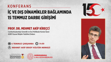 Büyükşehir Belediyesi ve İl Milli Eğitim Müdürlüğü iş birliğiyle 6 Temmuz Çarşamba günü Prof. Dr. Mehmet Akif Kireçci’nin katılımıyla ‘İç ve Dış Dinamikler Bağlamında 15 Temmuz Darbe Girişimi’ temalı konferans gerçekleştirilecek.