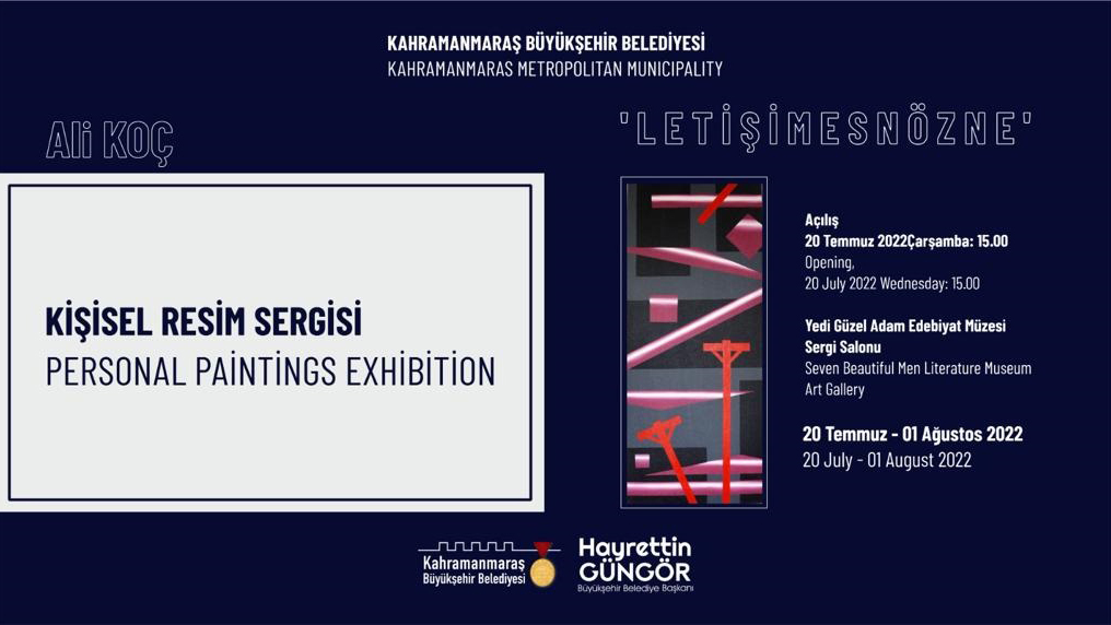Kahramanmaraş Büyükşehir Belediyesi, kültür sanat etkinliklerini Kahramanmaraşlılarla buluşturmaya devam ediyor. Etkinlikler kapsamında, 20 Temmuz Çarşamba günü ‘Letişimesnözne’ temalı resim sergisi sanatseverle buluşacak. Kahramanmaraş Sütçü İmam Üniversitesi Güzel Sanatlar Bölümü öğretim elemanı Ali Koç’un eserlerinin yer aldığı sergi, Yedi Güzel Adam Edebiyat Müzesi Sergi Salonu’nda saat 15.00’te ziyarete açılacak. 1 Ağustos Pazartesi gününe kadar devam edecek sergiyi sanatseverler ücretsiz olarak ziyaret edebilecek.