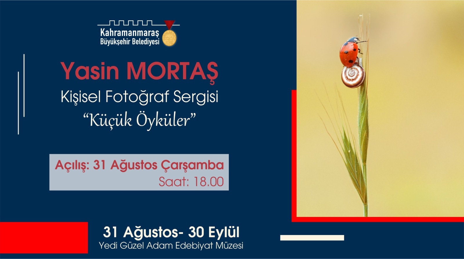 Kahramanmaraş Büyükşehir Belediyesi, kültür sanat etkinliklerini vatandaşlarla buluşturmaya devam ediyor. Bu kapsamda, 31 Ağustos Çarşamba günü “Küçük Öyküler” temalı kişisel fotoğraf sergisi sanatseverlerle buluşacak. Fotoğraf sanatçısı Yasin Mortaş’ın eserlerinin yer alacağı kişisel fotoğraf sergisi, Yedi Güzel Adam Edebiyat Müzesi’nde saat 18.00’de ziyarete açılacak. 30 Eylül tarihine kadar devam edecek sergiyi sanatseverler ücretsiz olarak ziyaret edebilecek. Büyükşehir Belediyesi’nden yapılan açıklamada, 31 Ağustos Çarşamba günü gerçekleştirilecek sergi açılışına tüm sanatseverlerin davetli olduğu belirtildi.