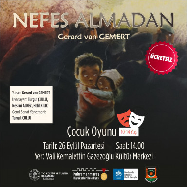 Kahramanmaraş Büyükşehir Belediyesi, Ademloos (Nefes Almadan) adlı tiyatro gösterisini çocuklarla buluşturacak. Hollanda Büyükelçiliği Uluslararası Kültürel Hareketlilik Fonu tarafından finanse edilen proje kapsamında, çocuk edebiyatı yazarı Gerard Van Gemert tarafından kaleme alınan eser perdelerini çocuklar için açacak. Geçtiğimiz aylarda şehir merkezinde ve ilçelerde izleyiciyle buluşan tiyatro gösterisi, 24 – 25 Eylül tarihlerinde bu kez Necip Fazıl Kısakürek Kültür Merkezi’nde sahnelenecek. 10 – 14 yaş aralığındaki çocuklara yönelik gerçekleştirilecek etkinlik, saat 13.00’te başlayacak. Büyükşehir Belediyesi’nden yapılan açıklamada, ücretsiz tiyatro gösterisine tüm çocukların davetli olduğu belirtildi.