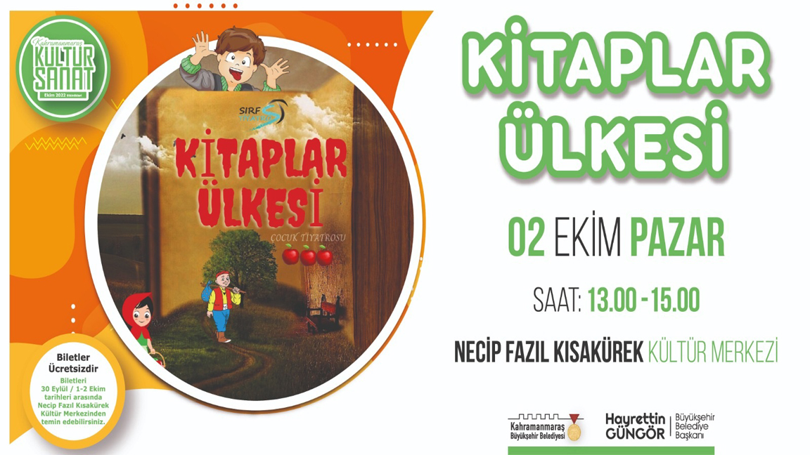 Kahramanmaraş Büyükşehir Belediyesi, birbirinden eğlenceli, eğitici ve öğreticileri etkinlikleri çocuklarla buluşturmaya devam ediyor. Bu kapsamda, 2 Ekim Pazar günü “Kitaplar Ülkesi” adlı çocuk tiyatrosu minikler için perdelerini açacak. Necip Fazıl Kısakürek Kültür Merkezi’nde gerçekleştirilecek tiyatro gösterisi saat 13.00 ve 15.00 olmak üzere 2 seans şeklinde sahnelenecek. Büyükşehir Belediyesi’nden yapılan açıklamada, gösterinin biletlerinin Necip Fazıl Kısakürek Kültür Merkezi’nden ücretsiz olarak temin edilebileceği belirtildi.