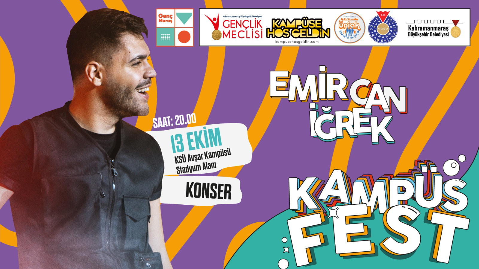 Büyükşehir Belediyesi tarafından düzenlenen “Kampüs Fest” 13 Ekim Perşembe günü de eğlence dolu etkinliklerle devam edecek. KSÜ’de saat 14.00’da gerçekleştirilecek etkinliğin ardından KSÜ Avşar Kampüsü Stadyum Alanı’nda saat 20.00’da ünlü sanatçı Emir Can İğrek sahne alacak.