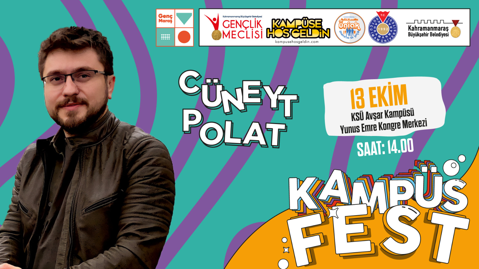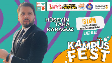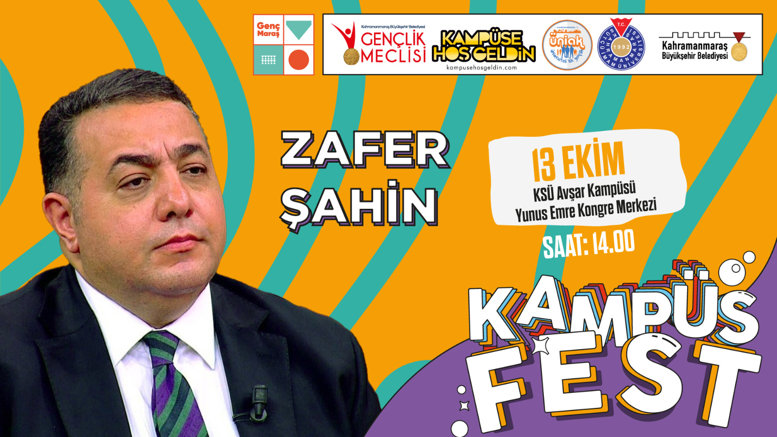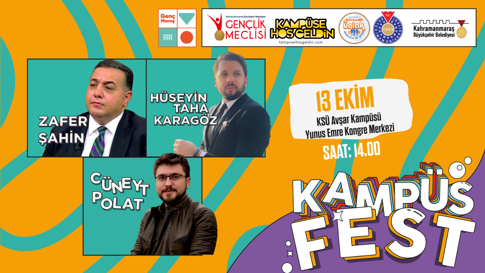 Kahramanmaraş Büyükşehir Belediyesi tarafından Genç Maraş mottosuyla hayata geçirilen “Kampüs Fest” ikinci gününde Kahramanmaraşlı gençlerle buluşmaya devam edecek. Festival kapsamında 13 Ekim Perşembe günü KSÜ Avşar Kampüsü Yunus Emre Kongre Merkezi’nde gerçekleştirilecek etkinlikte ünlü isimler Zafer Şahin, Hüseyin Taha Karagöz ve Cüneyt Polat gençlerle bir araya gelecek. Saat 14.00’da başlayacak etkinliğe tüm vatandaşlar davet edildi.