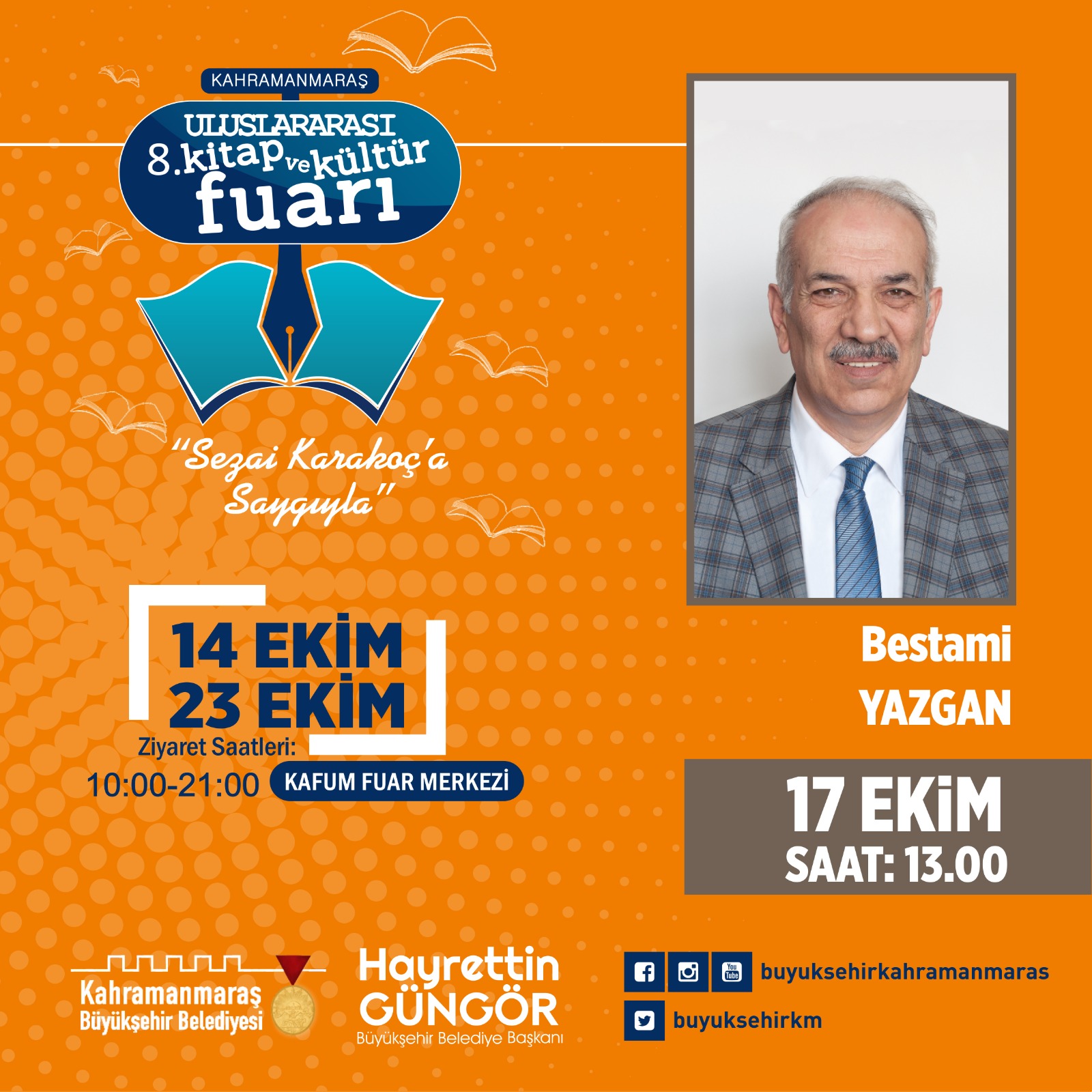 Kahramanmaraş 8. Uluslararası Kitap ve Kültür Fuarı’nda 17 Ekim Pazartesi günü usta kalemler ve alanında uzman isimler edebiyatseverlerle buluşacak. Fuarda saat 14.00’da Büyükşehir Belediye Başkanı Hayrettin Güngör de kültür sanat dostlarıyla bir araya gelecek.