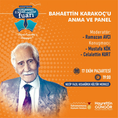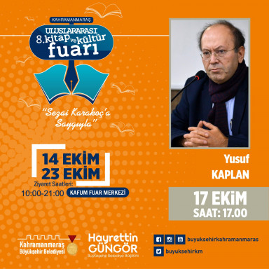 Kahramanmaraş 8. Uluslarası Kitap ve Kültür Fuarı, yüzlerce yayınevi ve yazar ile binlerce kitabı edebiyatseverlerle buluşturmaya devam ediyor. İmza günü, söyleşi ve panel gibi çeşitli etkinliklerin düzenlendiği fuarda; 17 Ekim Pazartesi günü saat 10.00’da Tarihçi - Yazar Mehmet Işık, saat 13.00’da Şair - Yazar Bestami Yazgan, saat 16.00’da Yazar Sait Mermer ve saat 17.00’da Gazeteci - Yazar Yusuf Kaplan söyleşi ve imza günü etkinliklerinde kültür sanat dostlarıyla buluşacak. Saat 19.00’da gerçekleştirilecek etkinlikte ise ebediyete göç etmiş Kahramanmaraşlı usta şair Bahaeddin Karakoç’u anma programı düzenlenecek.
