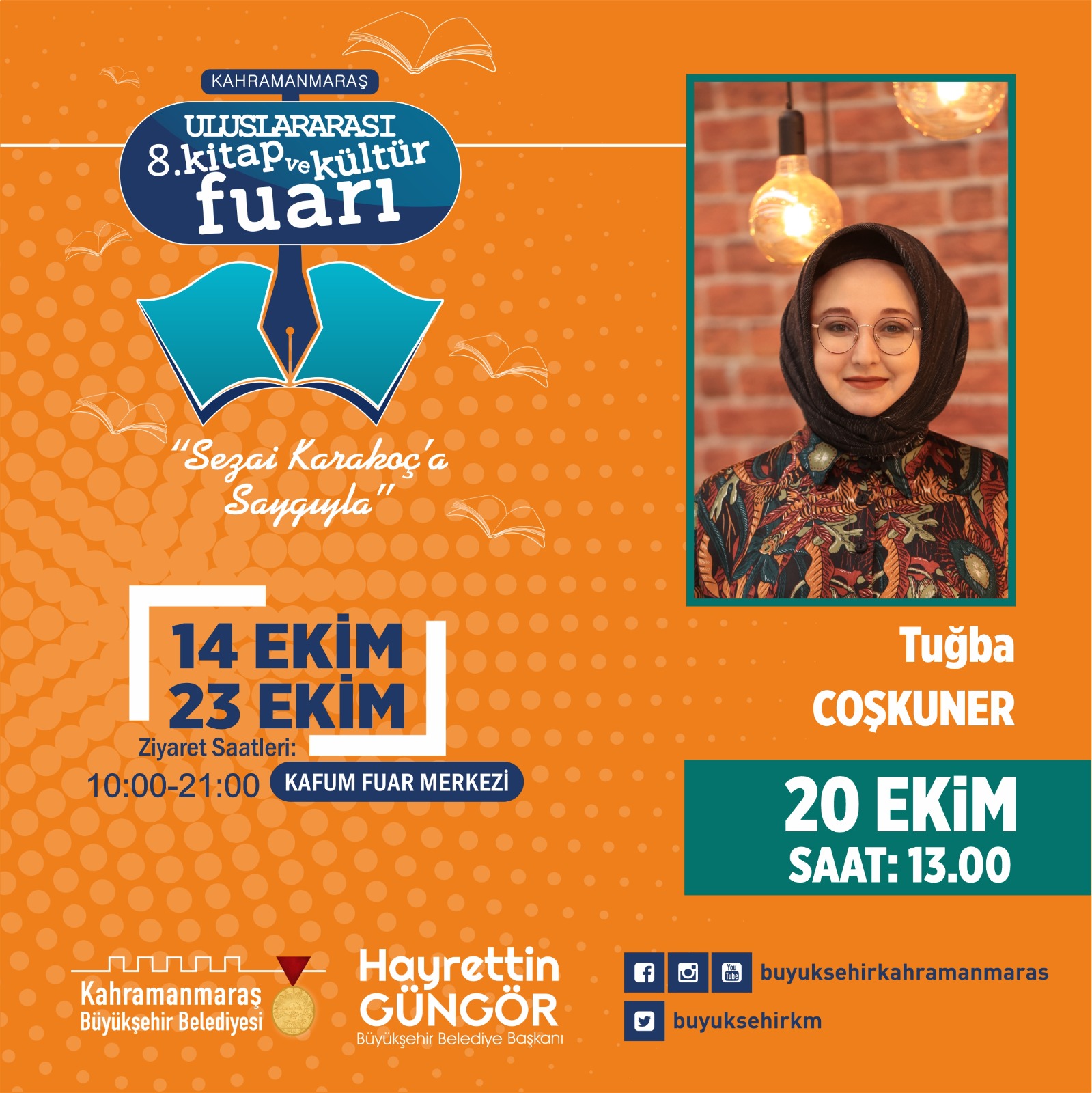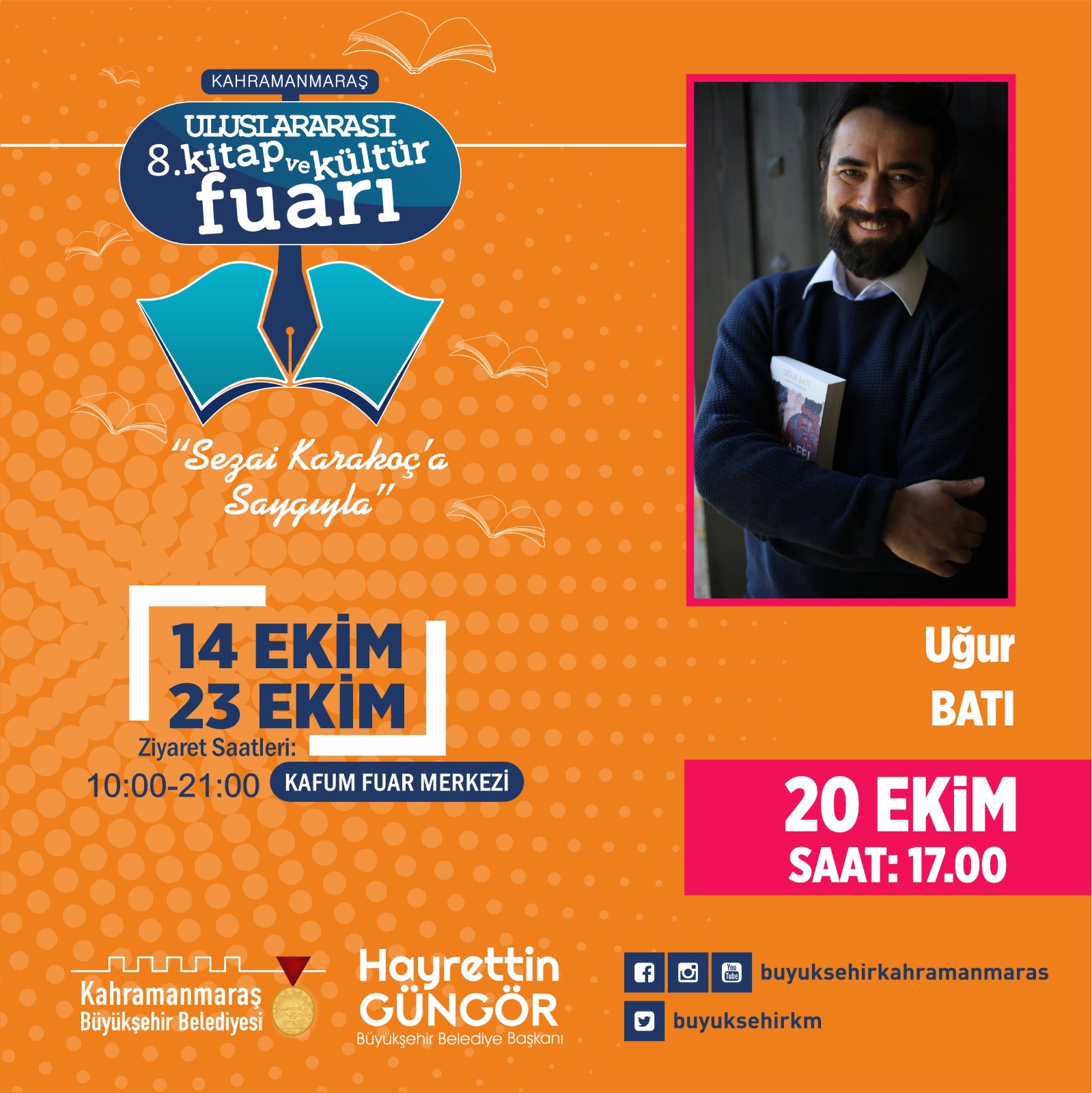 Kahramanmaraş Büyükşehir Belediyesi tarafından düzenlenen 8. Uluslararası Kitap ve Kültür Fuarı 20 Ekim Perşembe günü imza günü, söyleşi ve panel etkinlikleriyle hız kesmeden devam edecek. Etkinlikler saat 10.00 – 11.00 ve 12.00’da gerçekleştirilecek Mustafa Değirmenci söyleşisiyle start alacak. Ardından saat 13.00’da Yazar Tuğba Coşkuner, 17.00’da Prof. Dr. Uğur Batı, 18.00’da ise Yazar Turan Karataş okurlarla bir araya gelecek.