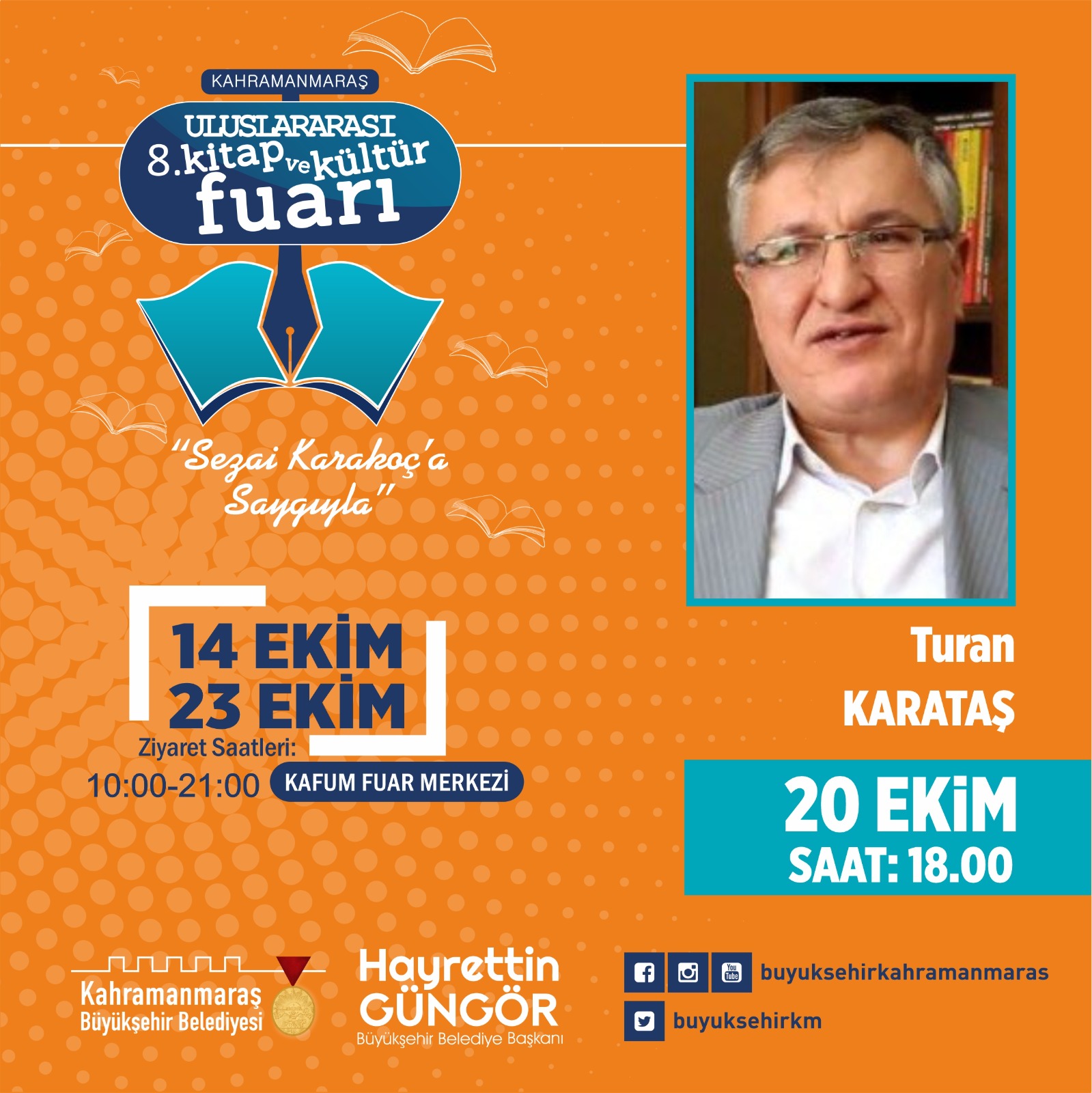 Büyükşehir Belediyesi tarafından düzenlenen 8. Uluslararası Kitap ve Kültür Fuarı’nda 20 Ekim Perşembe günü usta kalemler ve alanında uzman isimlerin yanı sıra AK Parti Genel Başkan Yardımcısı Mustafa Şen ve MKYK Üyesi Burhan Sakallı Kahramanmaraşlılarla bir araya gelecek.