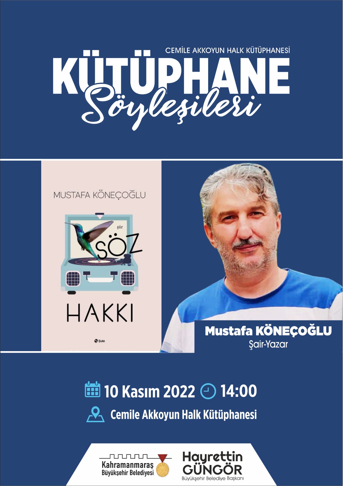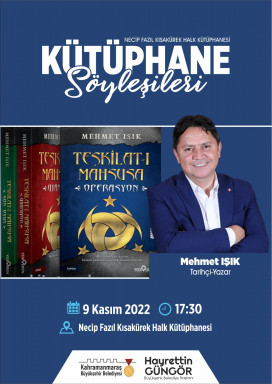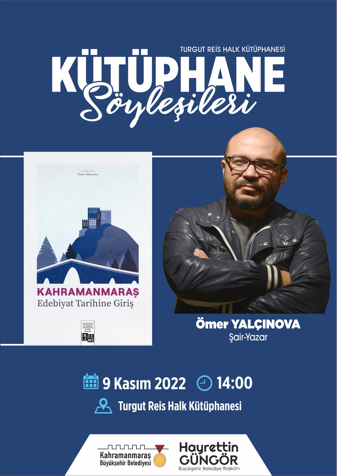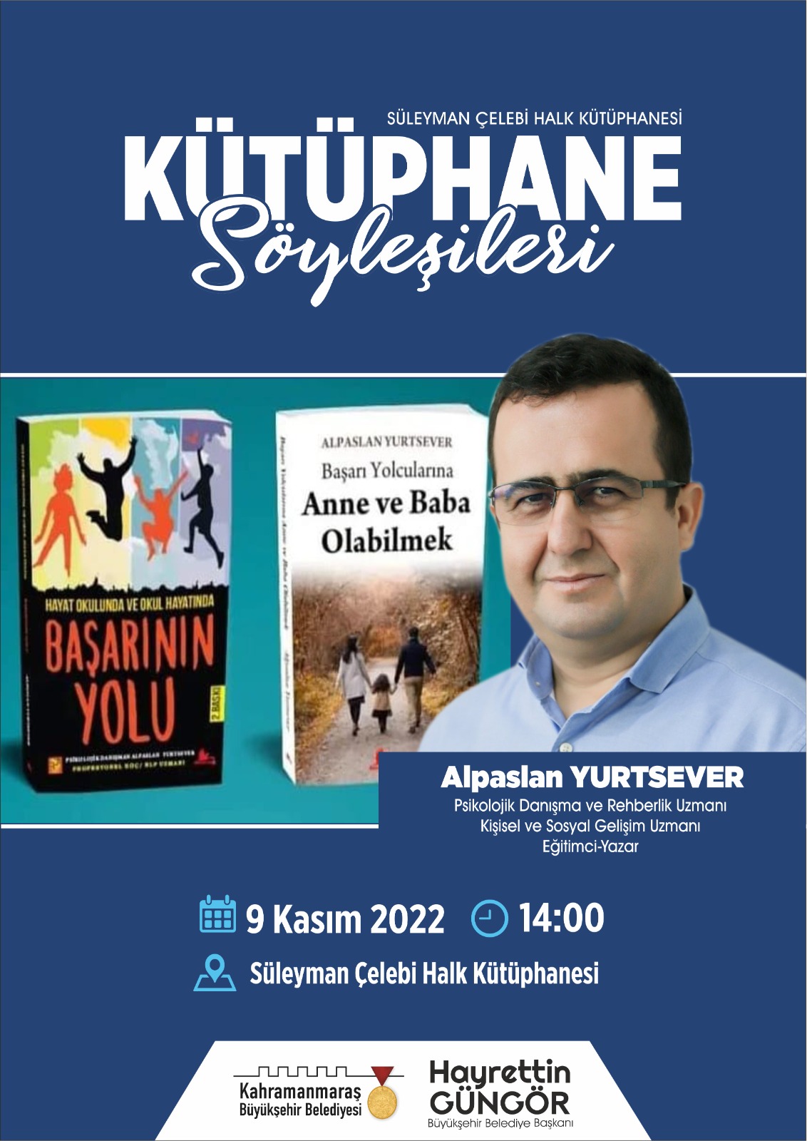 Kütüphane Söyleşileri; 9 Kasım Çarşamba günü saat 14.00’da Süleyman Çelebi Halk Kütüphanesi’nde Psikolojik Danışma ve Rehberlik Uzmanı Alpaslan Yurtsever’in ve Turgut Reis Halk Kütüphanesi’nde Şair – Yazar Ömer Yalçınova’nın katılımıyla gerçekleştirilecek etkinliklerle devam edecek. Aynı gün saat 17.30’da ise Tarihçi – Yazar Mehmet Işık, Necip Fazıl Kısakürek Halk Kütüphanesi’nde okurlarla bir araya gelecek.