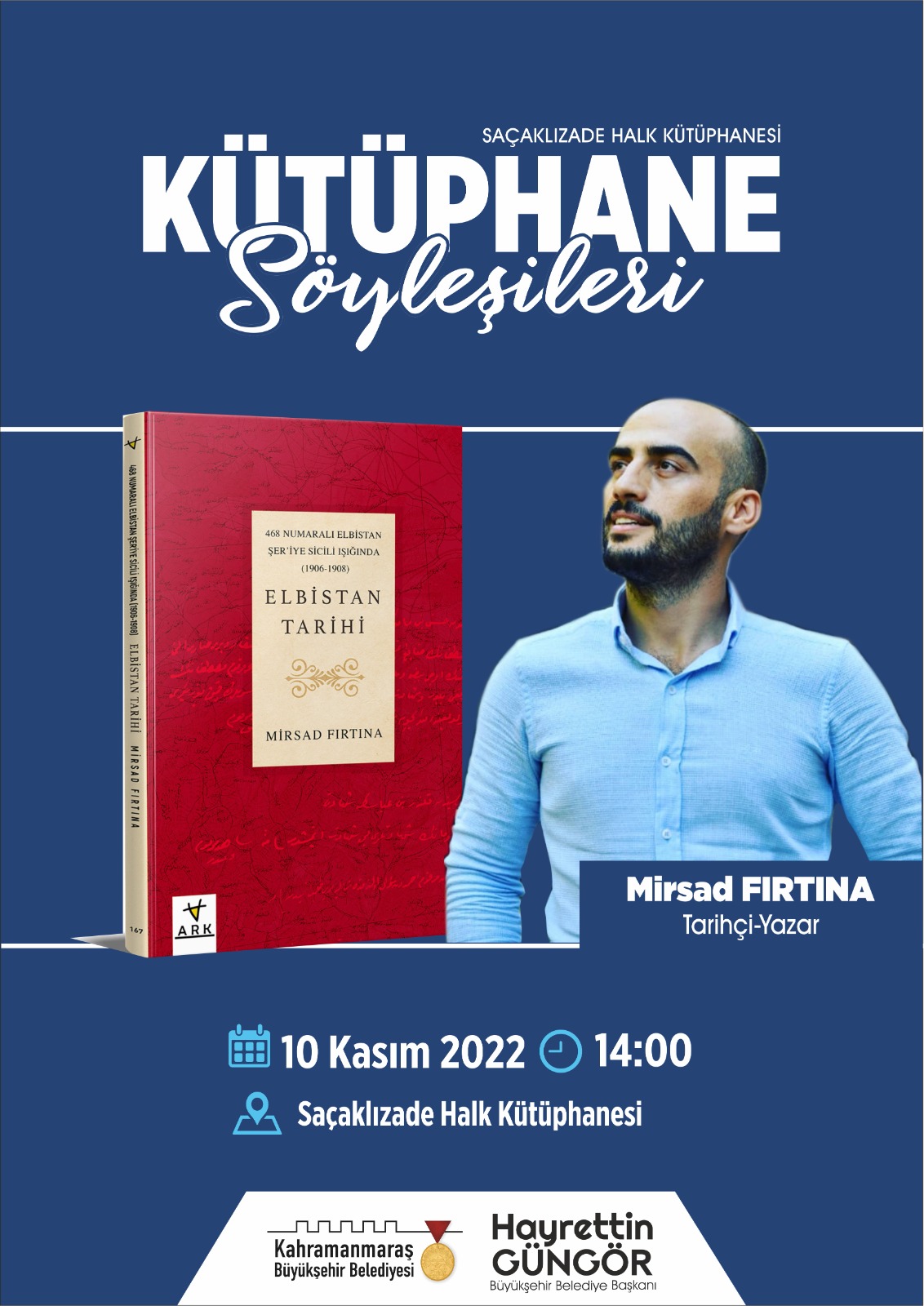 Etkinlik takvimi kapsamında; 10 Kasım Perşembe günü saat 14.00’da Saçaklızade Halk Kütüphanesi’nde Tarihçi – Yazar Mirsad Fırtına söyleşisi düzenlenecek. Yine saat 14.00’da Şair – Yazar Mustafa Köneçoğlu, Cemile Akkoyun Halk Kütüphanesi’nde okurlarla bir araya gelecek. Kütüphane Söyleşileri, 11 Kasım Cuma günü saat 14.00’da Erzurumlu İbrahim Hakkı Hazretleri Halk Kütüphanesi’nde Tiyatro Yönetmeni – Yazar Salman Kapanoğlu’nun katılımıyla gerçekleştirilecek etkinlikle devam edecek. Kültür Spor ve Turizm Dairesi Başkanlığı’ndan yapılan açıklamada, etkinliklere tüm edebiyatseverlerin davetli olduğu belirtildi.