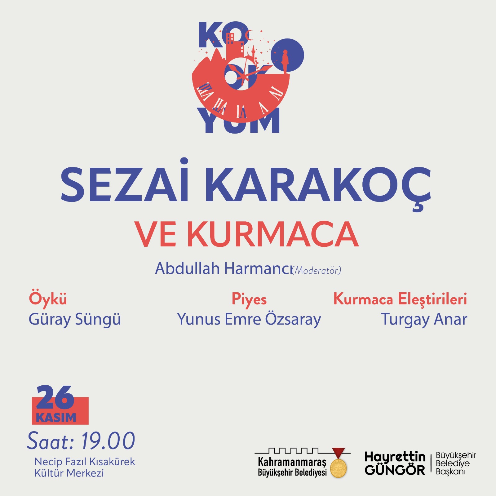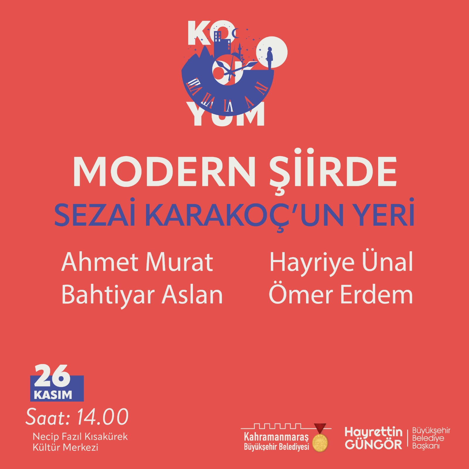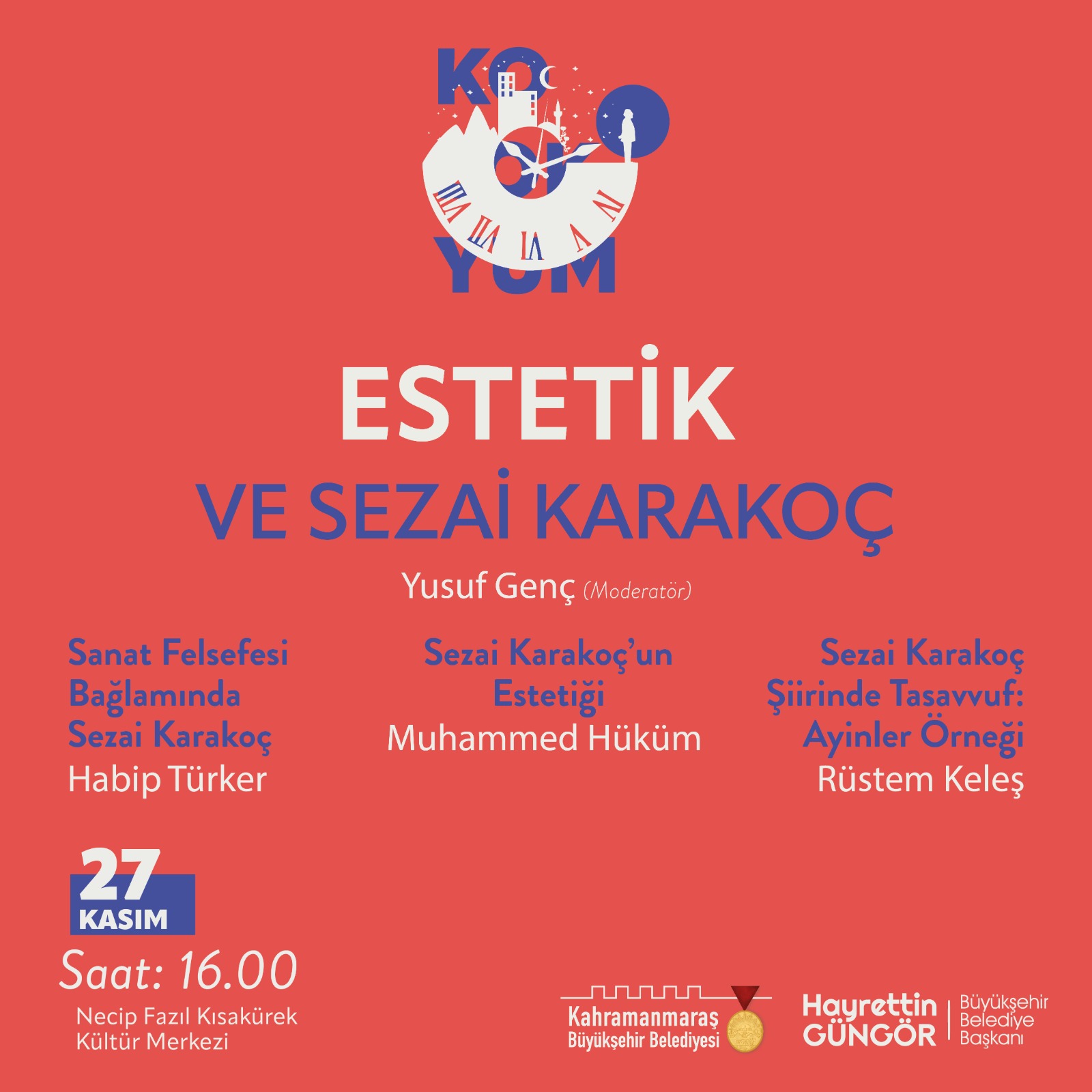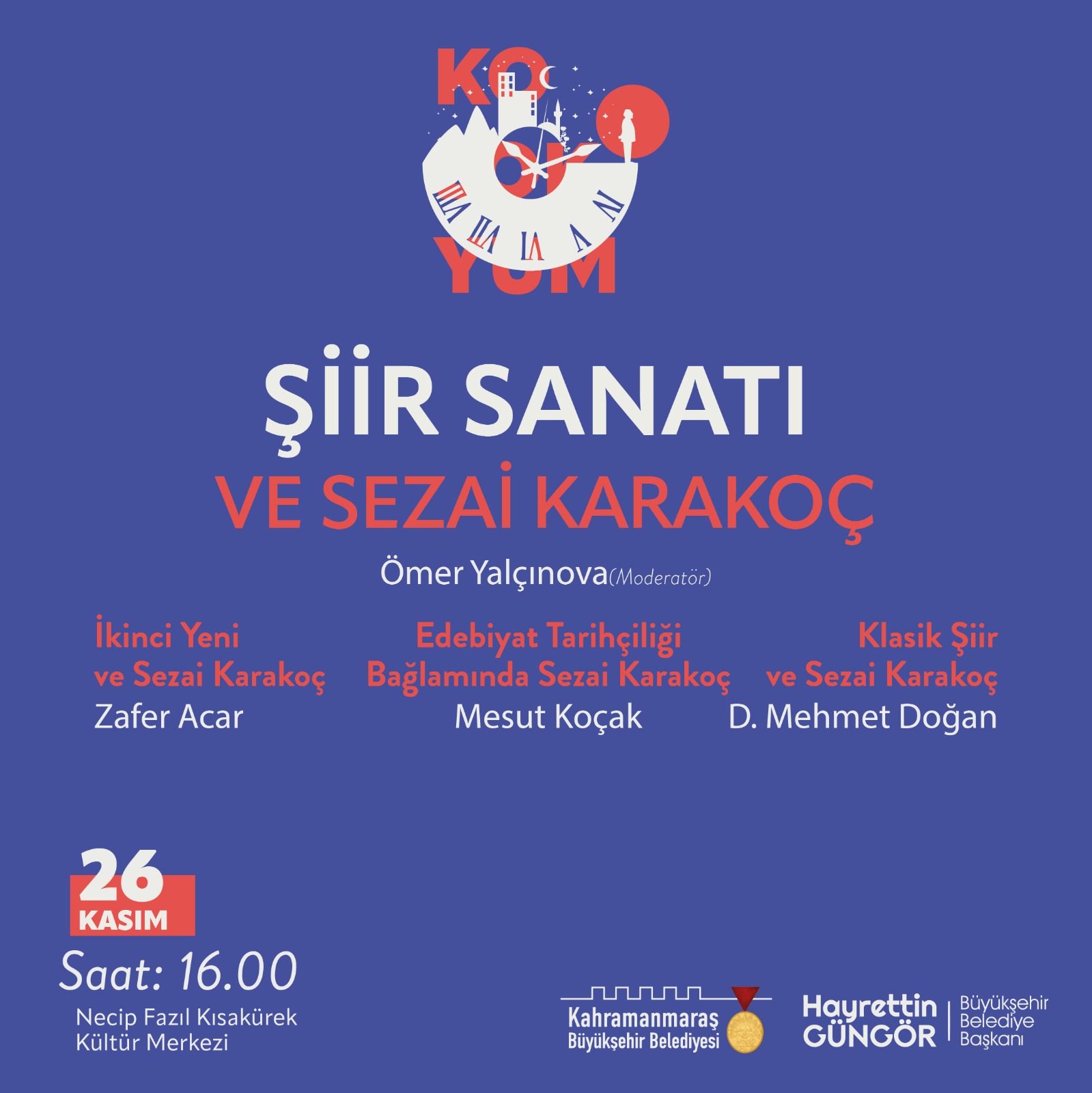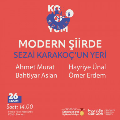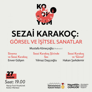 Kahramanmaraş Büyükşehir Belediyesi, Sezai Karakoç Kültür Sanat Sezonu’nda Türk Edebiyatı’nın usta isimlerinden, fikir ve düşünce insanı Sezai Karakoç’un eserlerinin, düşünce hayatının ve Türk edebiyatına kazandırdıklarının konuşulacağı ‘Kırkbirinci Saat Sezai Karakoç Kolokyumu’ adlı söyleşi etkinliğini edebiyatseverlerle buluşturacak. 26 ve 27 Kasım tarihlerinde Necip Fazıl Kısakürek Kültür Merkezi’nde gerçekleştirilecek kolokyumda usta kalemler, uzman isimler ve tanınmış simalar Sezai Karakoç’u anlatacak. Kolokyum, 26 Kasım Cumartesi günü saat 14.00’da gerçekleştirilecek Modern Şiirde Sezai Karakoç’un Yeri konulu etkinlikle başlayacak. Saat 16.00’da gerçekleştirilecek Şiir Sanatı ve Sezai Karakoç ile 19.00’da düzenlenecek Sezai Karakoç ve Kurmaca konulu etkinliklerde uzman konuklar Sezai Karakoç’u farklı perspektiften ele alacak.