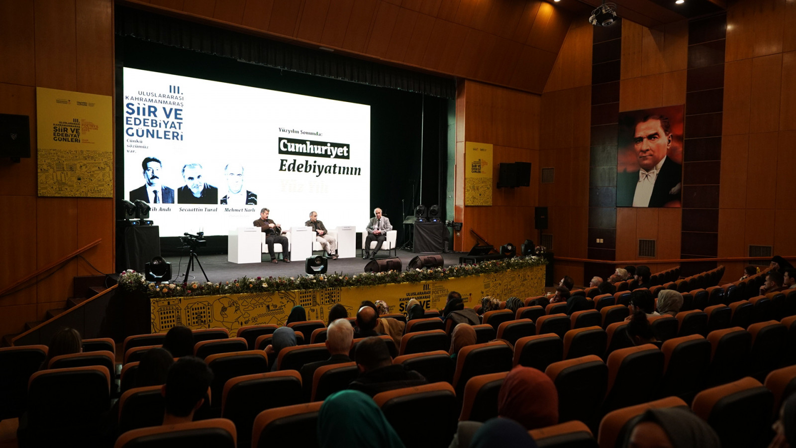 Kahramanmaraş Büyükşehir Belediyesi tarafından düzenlenen 3. Uluslararası Şiir ve Edebiyat Günleri kapsamında yazar - okur buluşmaları, konferans, şiir dinletileri ve konserler kültür sanat dostlarıyla buluşmaya devam ediyor. Etkinliklerin ikinci gününde de birbirinden değerli isimler edebiyatseverlerle bir araya geldi. Necip Fazıl Kısakürek Kültür Merkezi’nde düzenlenen ‘Cumhuriyet Edebiyatının Yüz Yılı’ konulu oturumda Prof. Dr. Secaattin Tural ve Prof. Dr. M. Fatih Andı, dinleyecilere seslendi. Oturum başkanlığını Prof. Dr. Mehmet Narlı’nın yaptığı etkinliğe edebiyatseverler yoğun ilgi gösterdi. 3’üncü Uluslararası Şiir ve Edebiyat Günleri tanıtım videosunun gösterimiyle başlayan etkinlikte usta kalemler, Cumhuriyet edebiyatına ışık tuttu. Katılımcılar, etkinlikten duyduğu memnuniyeti belirterek Büyükşehir Belediyesi’ne ve katılımcılara teşekkür etti.