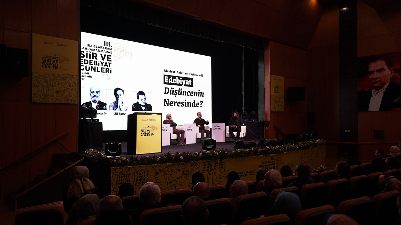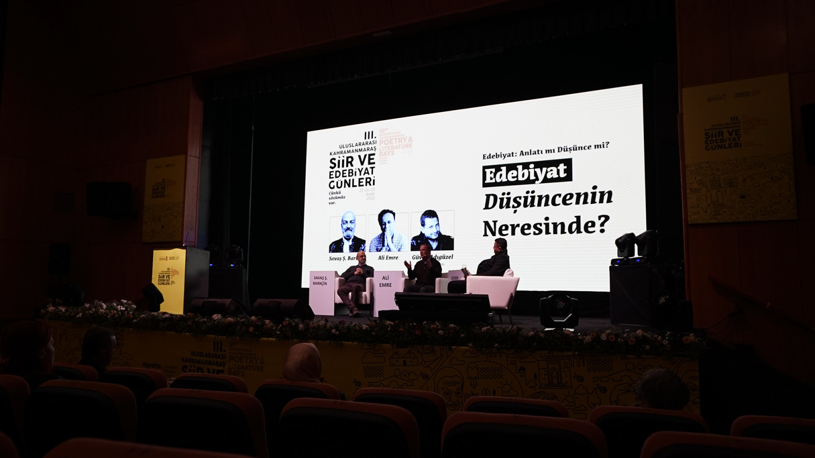 Kahramanmaraş Büyükşehir Belediyesi tarafından bu yıl 3’üncüsü düzenlenen ve görkemli bir programla açılışı gerçekleştirilen Uluslararası Şiir ve Edebiyat Günleri, ikinci gününde de çeşitli etkinlikleri edebiyatseverlerle buluşturmaya devam ediyor. Etkinlik takvimi kapsamında, Necip Fazıl Kısakürek Kültür Merkezi’nde Yazar Savaş Ş. Barkçin ve Ali Emre’nin katılımıyla ‘Edebiyat Düşüncenin Neresinde?’ temalı konferans düzenlendi. Yazar Güven Adıgüzel moderatörlüğünde gerçekleştirilen oturuma edebiyatseverler yoğun ilgi gösterdi. Katılımcılara çeşitli kitapların hediye edildiği etkinlikte konuşmacılar, edebiyatseverlerin sorularını da yanıtladı.