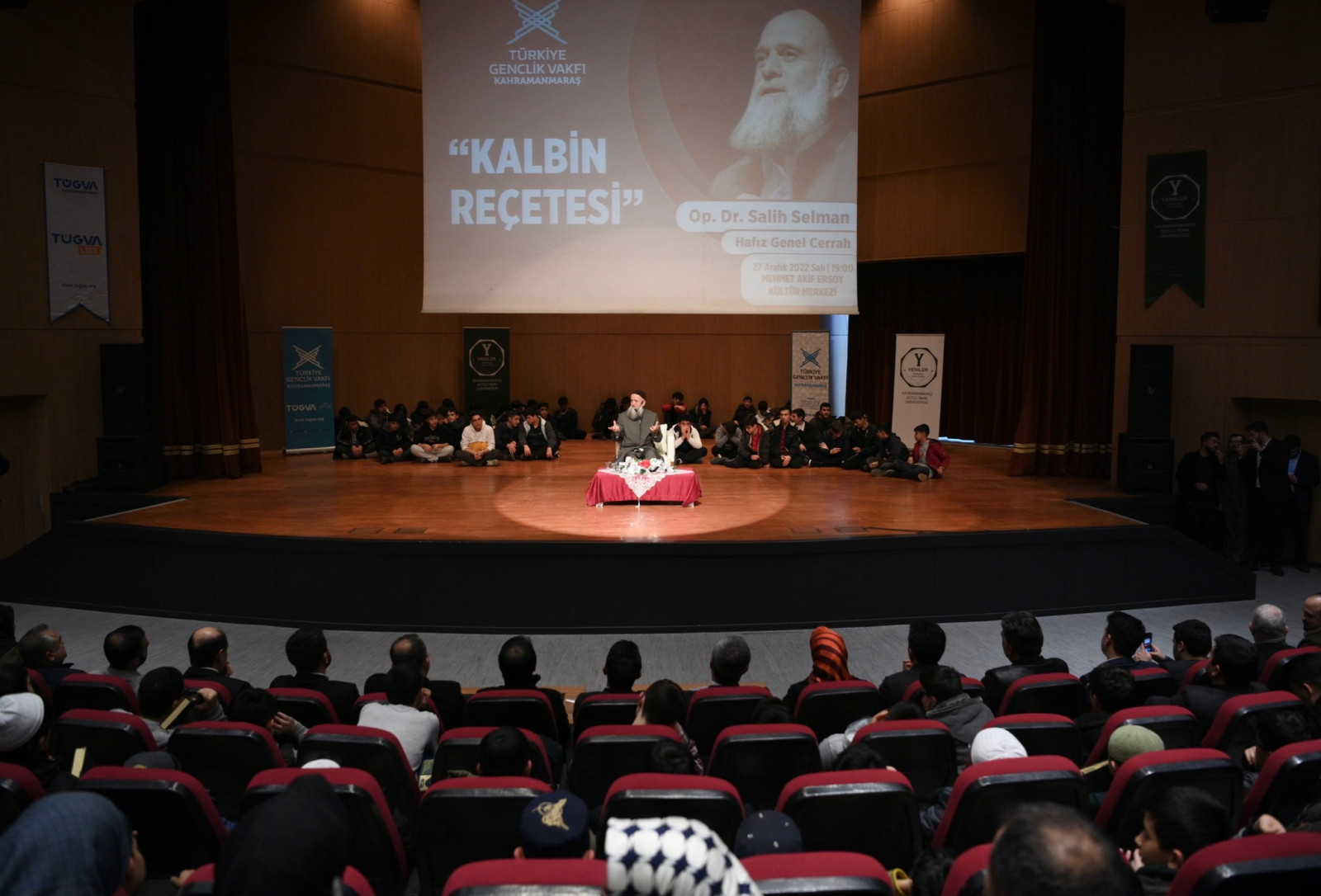 Kahramanmaraş Büyükşehir Belediye Başkanı Hayrettin Güngör, Türkiye Gençlik Vakfı (TÜGVA) İl Temsilciliği tarafından düzenlenen ‘Kalbin Reçetesi’ konulu söyleşi etkinliğine katıldı. Mehmet Akif Ersoy Kültür Merkezi’nde Hafız Op. Dr. Salih Selman’ın katılımıyla gerçekleştirilen program, saygı duruşu ve İstiklal Marşı’nın okunmasıyla başladı. Kur’an-ı Kerim Tilavetiyle devam eden programda; AK Parti İl Kadın Kolları Başkanı Gül Çitil Okur ve Gençlik Kolları Başkanı Feyzullah Eren Aşçı, Onikişubat İlçe Başkanı Mücahit Kara, TÜGVA Kahramanmaraş İl Temsilcisi Furkan Seyithanoğlu ile çok sayıda vatandaş da yer aldı.
