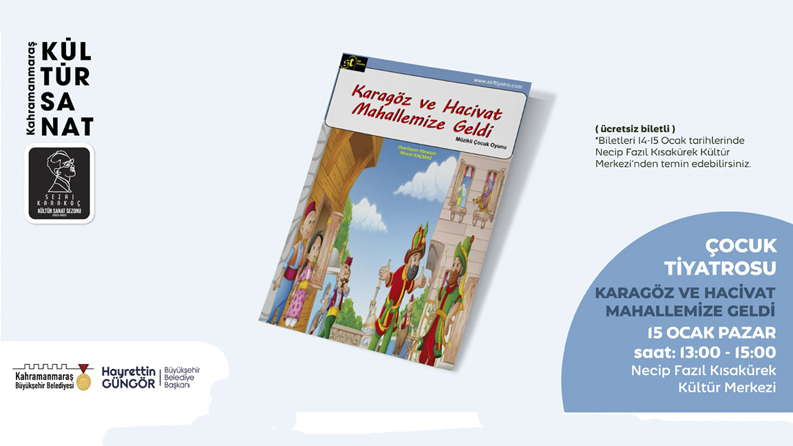 Kahramanmaraş Büyükşehir Belediyesi, genç dostu Başkan Hayrettin Güngör öncülüğünde birbirinden eğlenceli ve öğretici etkinlikler düzenlemeyi sürdürüyor. Ocak ayı kültür sanat etkinlikleri kapsamında 15 Ocak Pazar günü ‘Karagöz ve Hacivat Mahallemize Geldi’ adlı müzikli tiyatro gösterisi çocuklar için perdelerini açacak. Necip Fazıl Kısakürek Kültür Merkezi’nde sahnelenecek oyun saat 13.00 ve 15.00’da 2 seans şeklinde miniklerin karşısına çıkacak. Eğlendirirken aynı zamanda düşündüren ve öğretici mesajlar veren gösterinin biletleri 14 ve 15 Ocak tarihlerinde Necip Fazıl Kısakürek Kültür Merkezi’nden ücretsiz olarak temin edilebilecek. Büyükşehir Belediyesi’nden yapılan açıklamada, ücretsiz olarak gerçekleştirilecek olan Karagöz ve Hacivat Mahallemize Geldi adlı tiyatro gösterisine tüm çocukların davetli olduğu belirtildi.