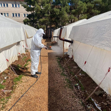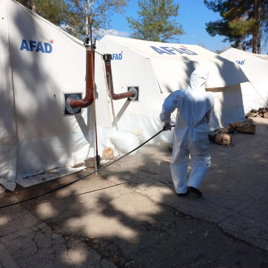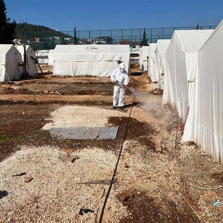 Şehirde altyapıdan ulaşıma, üstyapıdan su hizmetlerine tüm alanlarda çalışmalarını kesintisiz sürdüren Kahramanmaraş Büyükşehir Belediyesi, meydana gelebilecek olası salgın hastalıkların önüne geçerek halk sağlığını korumak için geçici barınma merkezleri başta olmak üzere ortak kullanım alanlarında temizlik, ilaçlama ve dezenfeksiyon çalışmalarını sürdürüyor. Çevre Koruma ve Kontrol Dairesi Başkanlığı’nca 105 araç ve 986 personelle yürütülen çalışmalarla ortak kullanım alanları çöp ve atıklardan temizlenirken geçici barınma merkezleri de dezenfekte ediliyor. Çevre Koruma ve Kontrol Dairesi Başkanlığı’ndan yapılan açıklamada, halk sağlığının korunması noktasında şehir genelinde temizlik, ilaçlama ve dezenfeksiyon çalışmalarının artarak devam ettiği belirtildi.