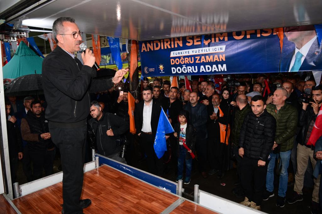 AK Parti Andırın Seçim Bürosu’nun açılışında konuşan Başkan Hayrettin Güngör, “Sayın Cumhurbaşkanımız, bu ülkede yapılamaz denilen pek çok şeyi ekibiyle birlikte başardı. Ülkemiz, hem bölgede hem de dünyada çok önemli bir aktör haline geldi. Bunun akamete uğramaması için 14 Mayıs seçimleri son derece önemli. İnşallah vatandaşlarımızın da desteğiyle bu süreç devam edecek. Yerel yöneticiler olarak bizler de üst düzeyde bir koordinasyonla hemşehrilerimize hizmet etmeye çalışıyoruz. Bu noktada Andırın’ımıza da çok ciddi yatırımlar kazandırdık. İlçemizin turizm potansiyelini artıracak yatırımlarımızı sürdürüyoruz. Andırın’ın otogar sorununu çözüme kavuşturuyoruz. İlçemize Mevlana İdris’in adını verdiğimiz bir millet konağı inşa ettik. Andırın’ın katma değerini artırmak için yatırımlarımız katlanarak devam ediyor” cümlelerini kaydetti.
