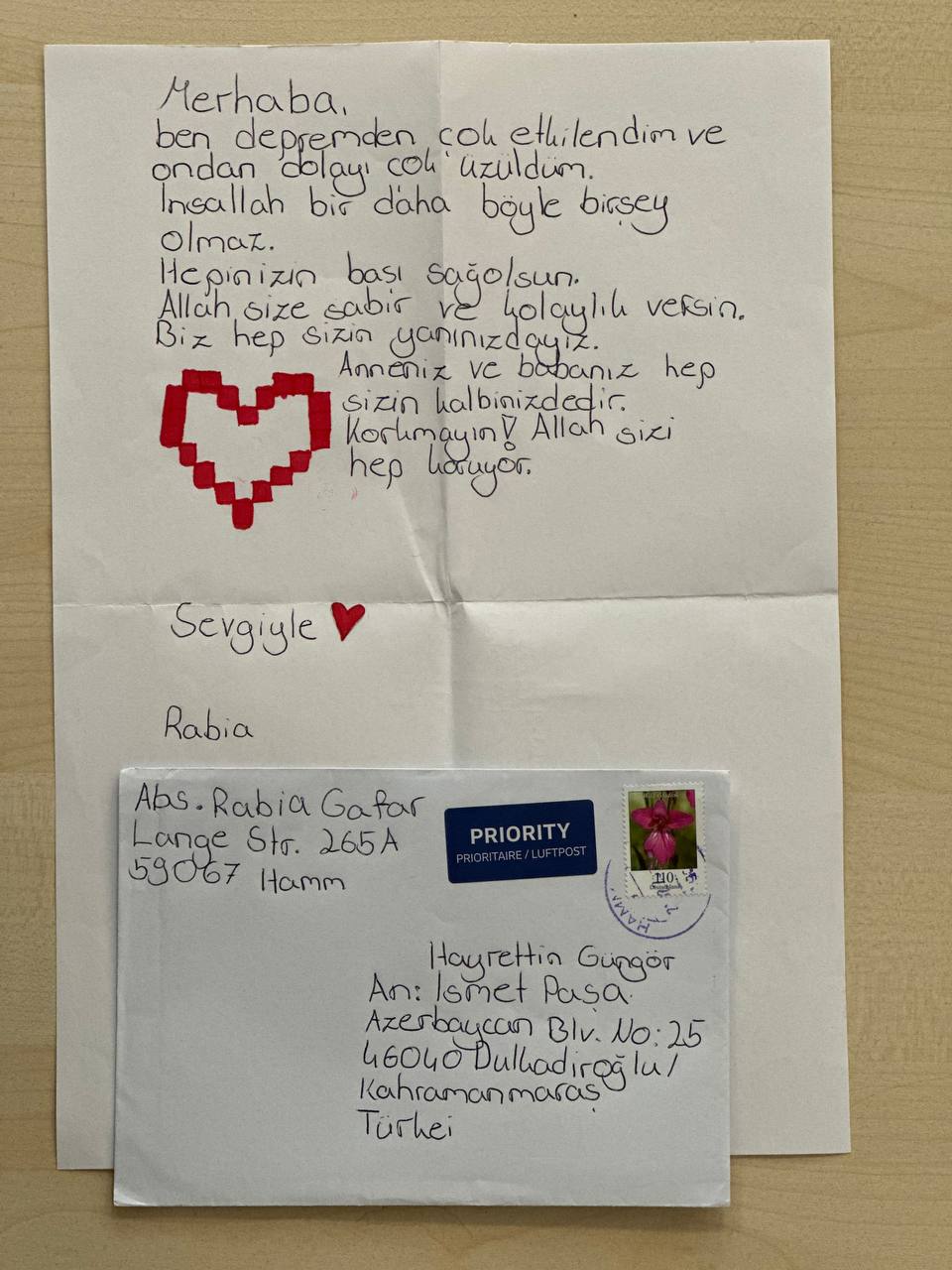 Başkan Hayrettin Güngör, Rabia Gafar’ın duygu yüklü mektubunu sosyal medya hesabından, “Büyük felaketin ardından onlarca paha biçilemez yardım ve bunlarla birlikte kocaman yüreklerden çıkan mektuplar aldık. Onlardan birisi de Almanya’daki yavrumuz Rabia’nın gönderdiği mektup ve harçlığıydı. Gözlerinden öpüyorum güzel yavrum. Allah seni ailene bağışlasın” ifadeleriyle paylaştı.