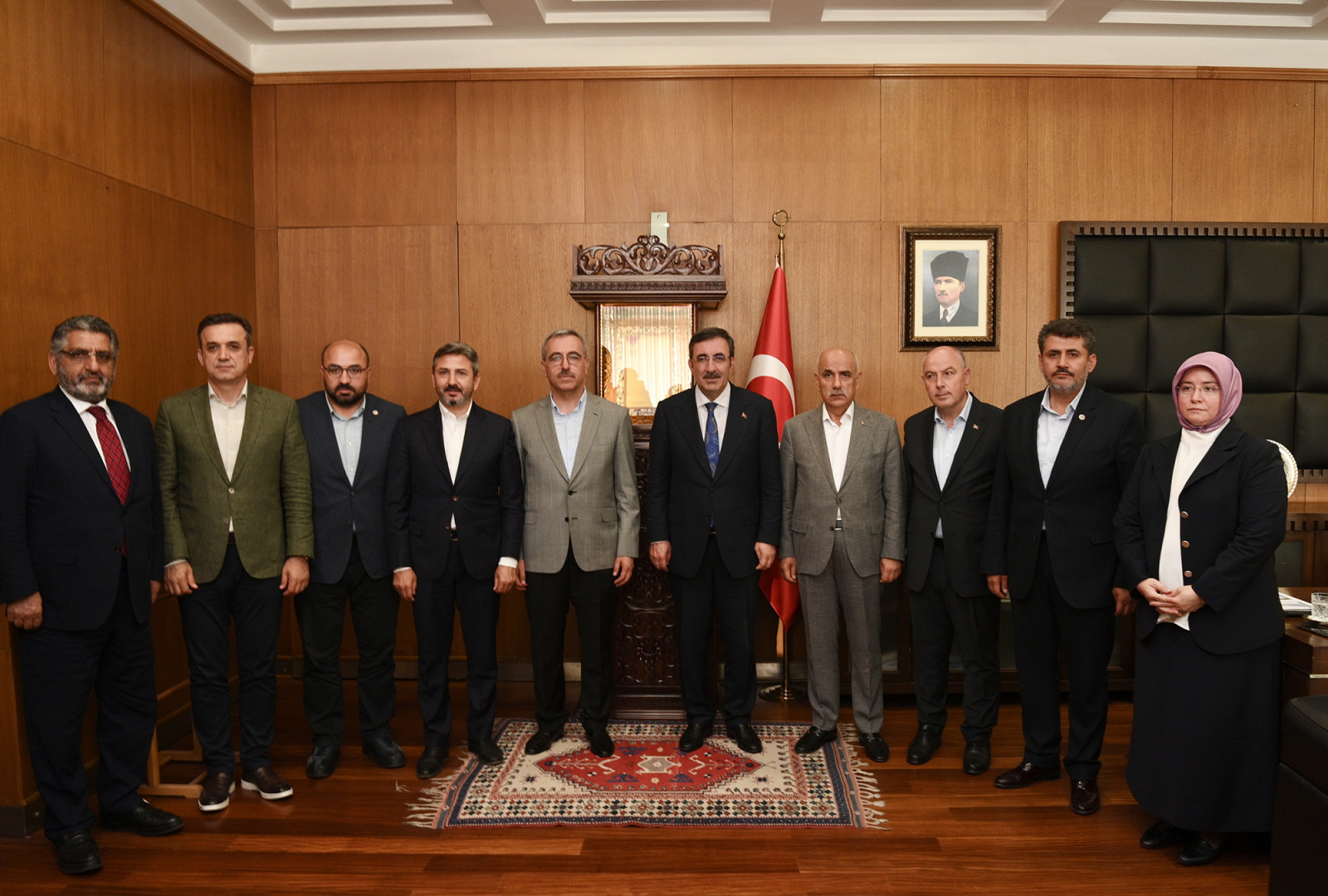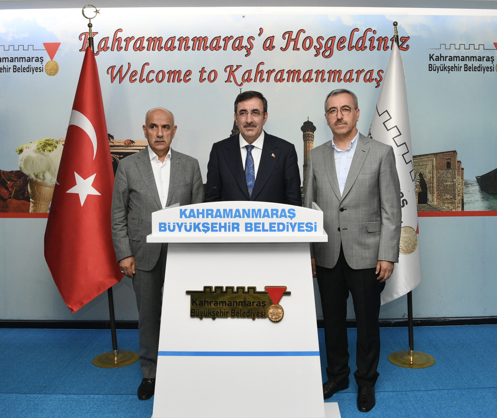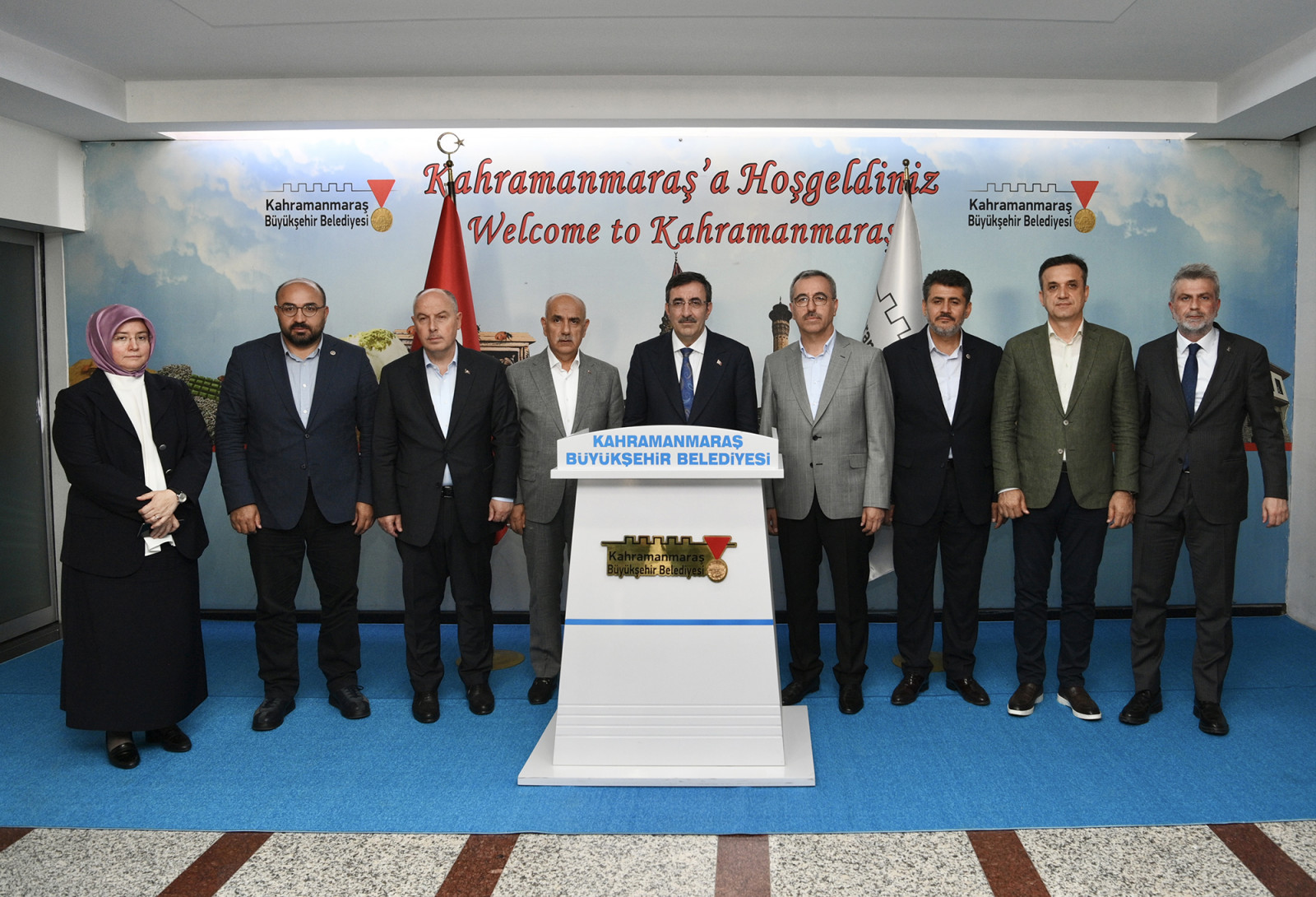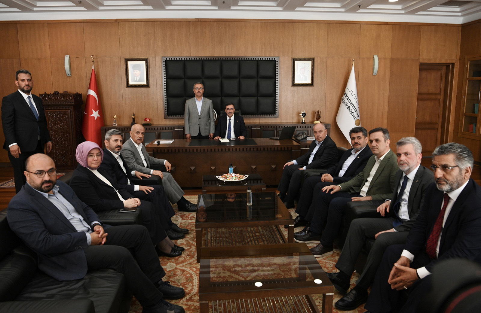 Kahramanmaraş Büyükşehir Belediye Başkanı Hayrettin Güngör, bir dizi ziyaret ve incelemelerde bulunmak üzere şehre gelen Cumhurbaşkanı Yardımcısı Cevdet Yılmaz’ı makamında ağırladı. TBMM Tarım, Orman ve Köyişleri Komisyonu Başkanı Prof. Dr. Vahit Kirişci, Vali Ömer Faruk Coşkun, AK Parti Kahramanmaraş Milletvekilleri ve İl Başkanı Fırat Görgel’in de yer aldığı ziyarette Başkan Hayrettin Güngör, Cumhurbaşkanı Yardımcısı Cevdet Yılmaz ve beraberindeki heyete; şehirde altyapıdan ulaşıma, üstyapıdan barınmaya, sosyal yardımdan geçici konaklama merkezlerine, kentsel dönüşümden kalıcı konutlara tüm alanlarda yürütülen ve planlanan faaliyetlere ilişkin bilgiler aktardı.