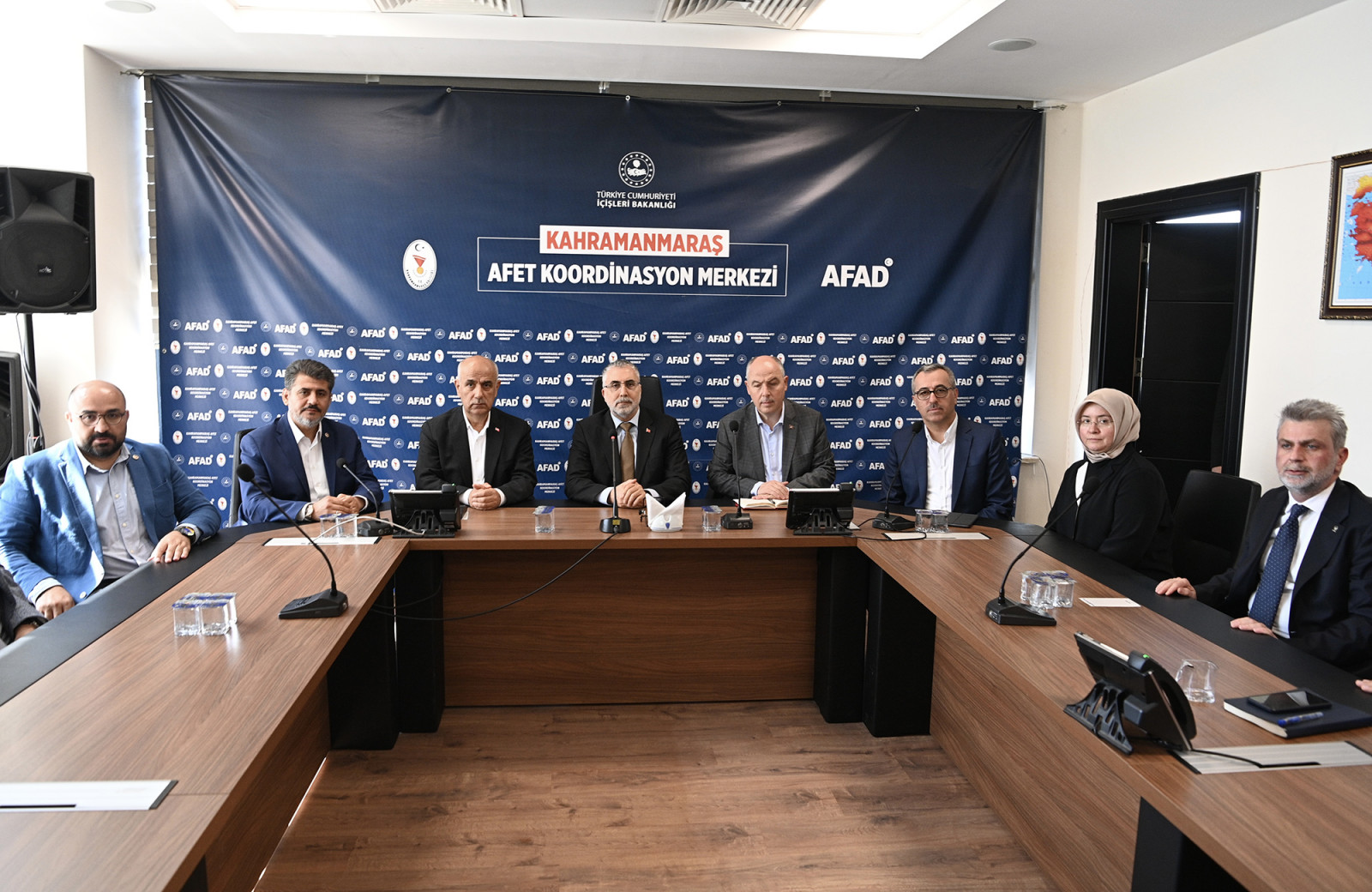 Kahramanmaraş Büyükşehir Belediye Başkanı Hayrettin Güngör, bir dizi ziyaret ve incelemelerde bulunmak üzere şehre gelen Çalışma ve Sosyal Güvenlik Bakanı Prof. Dr. Vedat Işıkhan ile Afet Koordinasyon Merkezi’nde düzenlenen istişare ve değerlendirme toplantısına katıldı. TBMM Tarım, Orman ve Köyişleri Komisyonu Başkanı Prof. Dr. Vahit Kirişci, Vali Ömer Faruk Coşkun, AK Parti Kahramanmaraş Milletvekilleri Ömer Oruç Bilal Debgici, Dr. Tuba Köksal ve Prof. Dr. Mehmet Şahin, AK Parti İl Başkanı Fırat Görgel, ilçe belediye başkanları ve kurum yetkililerinin de yer aldığı toplantıda; şehrin imar ve inşası noktasında yürütülen faaliyetler, kalıcı konut ve iş yerlerinin inşası, ticaretin canlandırılması için gerçekleştirilen yatırımlar gibi pek çok konuya ilişkin istişarelerde bulunuldu.