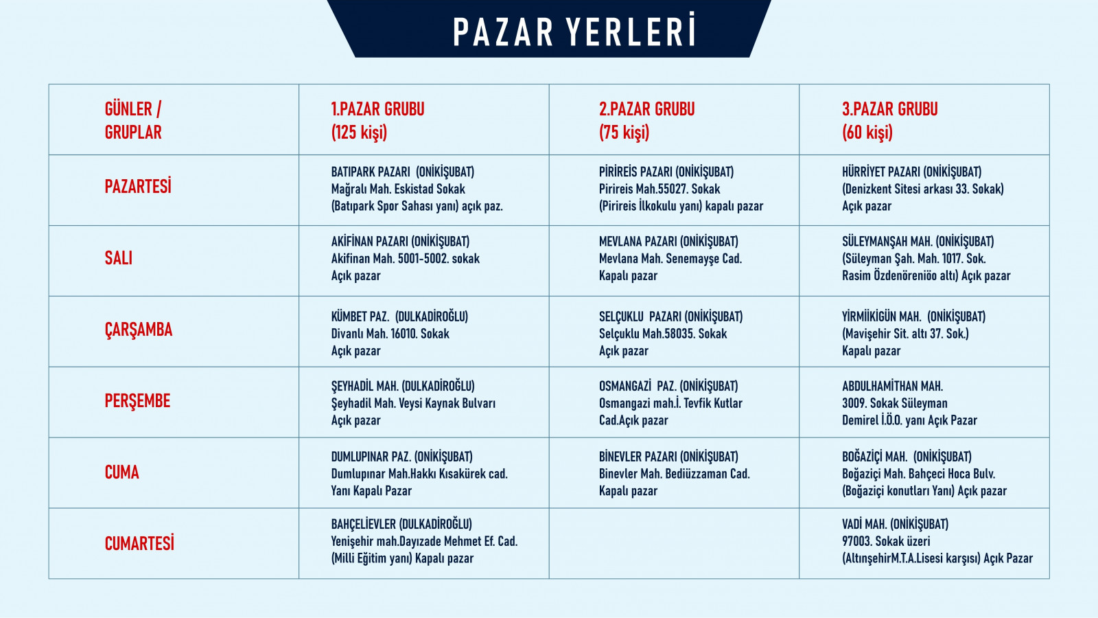 Deprem sonrası hayatın yeniden normalleşmesi kapsamında şehir merkezinde gelişigüzel konumlanan tezgâhların kaldırılmasına yönelik bir çalışma başlatan ve esnafları pazar yerlerine yönlendiren Kahramanmaraş Büyükşehir Belediyesi, haftanın 6 günü hizmet verecek pazar yerlerini duyurdu. Onikişubat ve Dulkadiroğlu ilçelerinde açılan pazar yerlerinin listesine https://kahramanmaras.bel.tr/haftalik-semt-pazar-yerleri internet adresinden ulaşılabiliyor. Pazar günü hariç haftanın altı günü hizmet verecek pazar yerlerinin listesi;