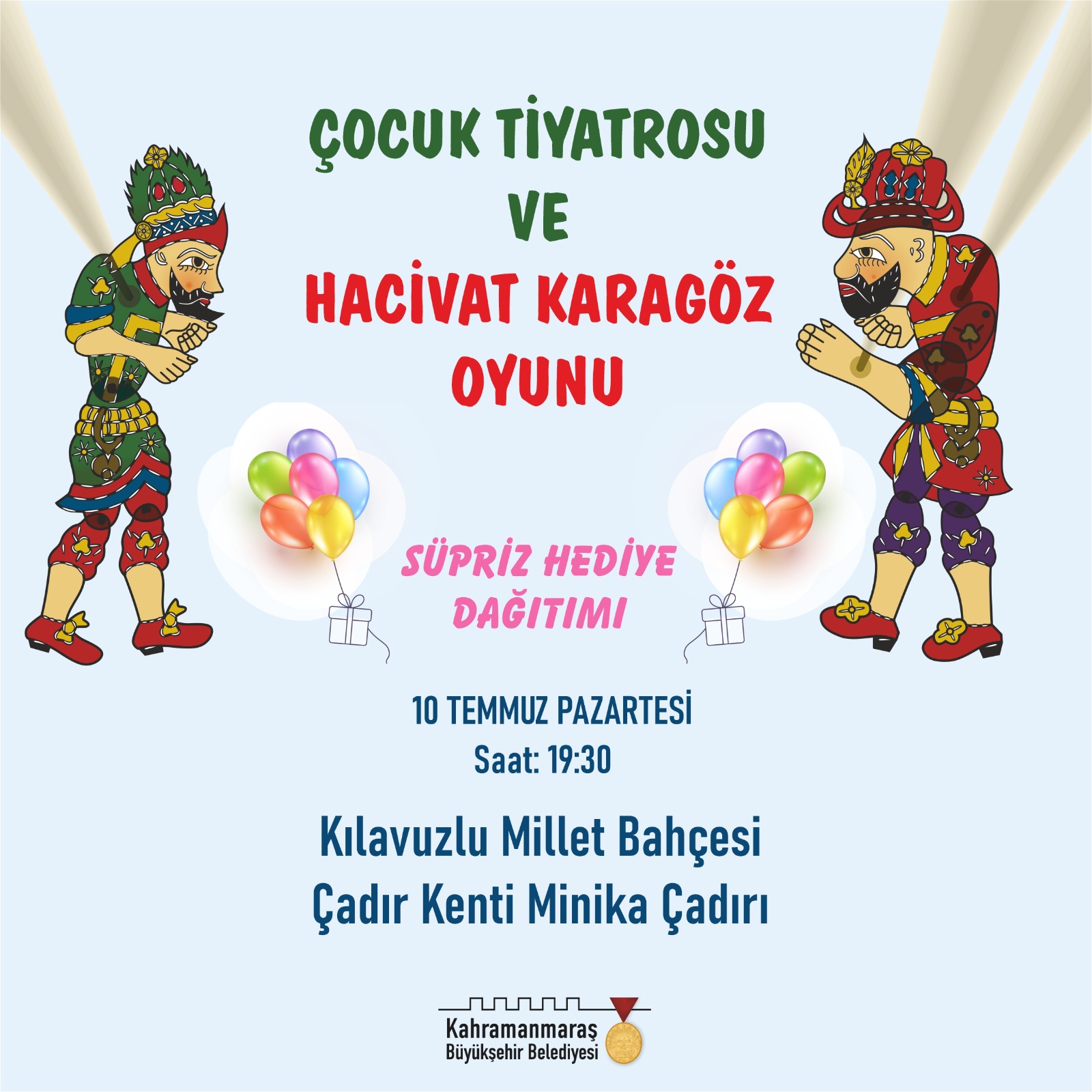 Kahramanmaraş Büyükşehir Belediyesi, bir yandan şehrin imarı ve inşası noktasında tüm alanlarda faaliyetlerini sürdürürken bir yandan da sosyal belediyecilik çerçevesinde vatandaşlara yönelik etkinlikler düzenlemeye devam ediyor. Hayatın normalleşmesi noktasında farklı yaş gruplarına yönelik çeşitli etkinlikler düzenleyen Büyükşehir Belediyesi, 10 Temmuz Pazartesi günü Kılavuzlu Millet Bahçesi Çadır Kent Minika Çadırı’nda çocuk tiyatrosu ve Hacivat Karagöz gösterisi düzenleyecek. Saat 19.30’da başlayacak etkinlikte miniklere sürpriz hediye dağıtımı da olacak. Büyükşehir Belediyesi’nden yapılan açıklamada, ücretsiz olarak gerçekleştirilecek etkinliğe tüm çocukların davetli olduğu belirtildi.