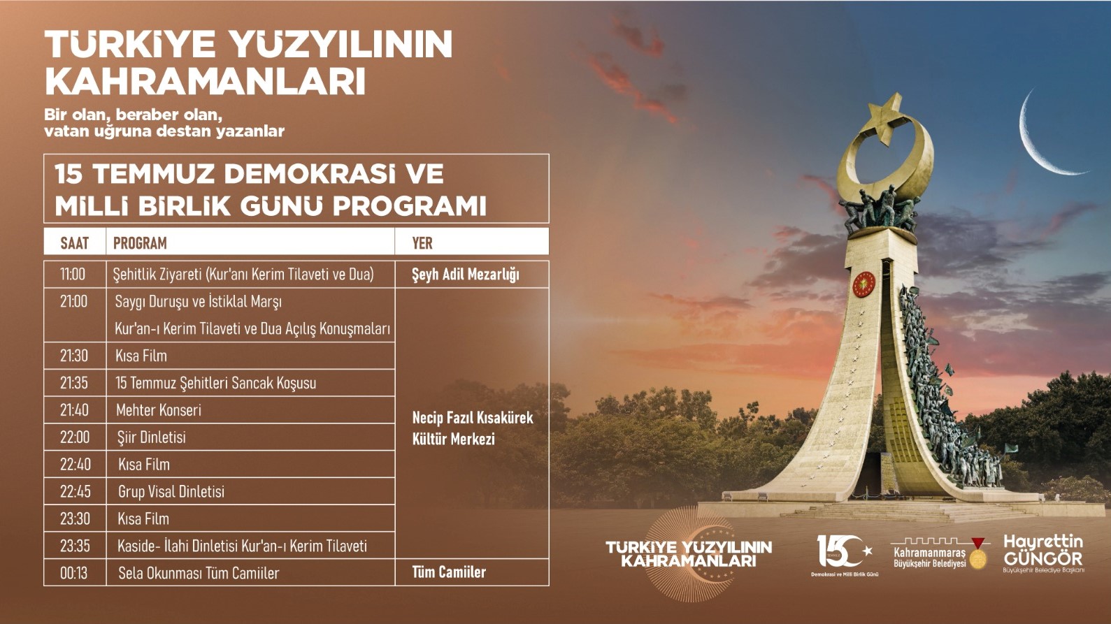 Büyükşehir Belediyesi, 15 Temmuz Demokrasi ve Milli Birlik Günü dolayısıyla çeşitli etkinliklerin düzenleneceğini duyurdu. 15 Temmuz Cumartesi günü NFK Kültür Merkezi’nde gerçekleştirilecek etkinliklere tüm Kahramanmaraşlılar davet edildi.