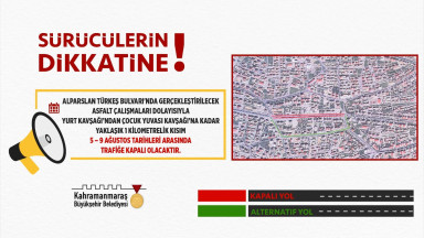 Binevler Bölgesi Cadde Yenileme projesi kapsamında Alparslan Türkeş Bulvarı’nda ikinci etap çalışmalarını da tamamlayan Kahramanmaraş Büyükşehir Belediyesi, caddenin kalan kısımlarının da asfaltını yeniliyor. Yurt Kavşağı’ndan Çocuk Yuvası Kavşağı’na kadar yaklaşık 1 kilometrelik kısımda gerçekleştirilecek asfalt çalışmaları dolayısıyla cadde 5 – 9 Ağustos tarihleri arasında trafiğe kapalı olacak. Büyükşehir Belediyesi’nden yapılan açıklamada; çalışmalar esnasında aksamaların meydana gelmemesi adına belirtilen tarihlerde caddeye araç park edilmemesi, trafikte herhangi bir olumsuzlukla karşılaşılmaması için trafik işaret ve işaretçilerine uyulması ve ulaşımda alternatif güzergâhların kullanılmasının önem arz ettiği belirtildi.