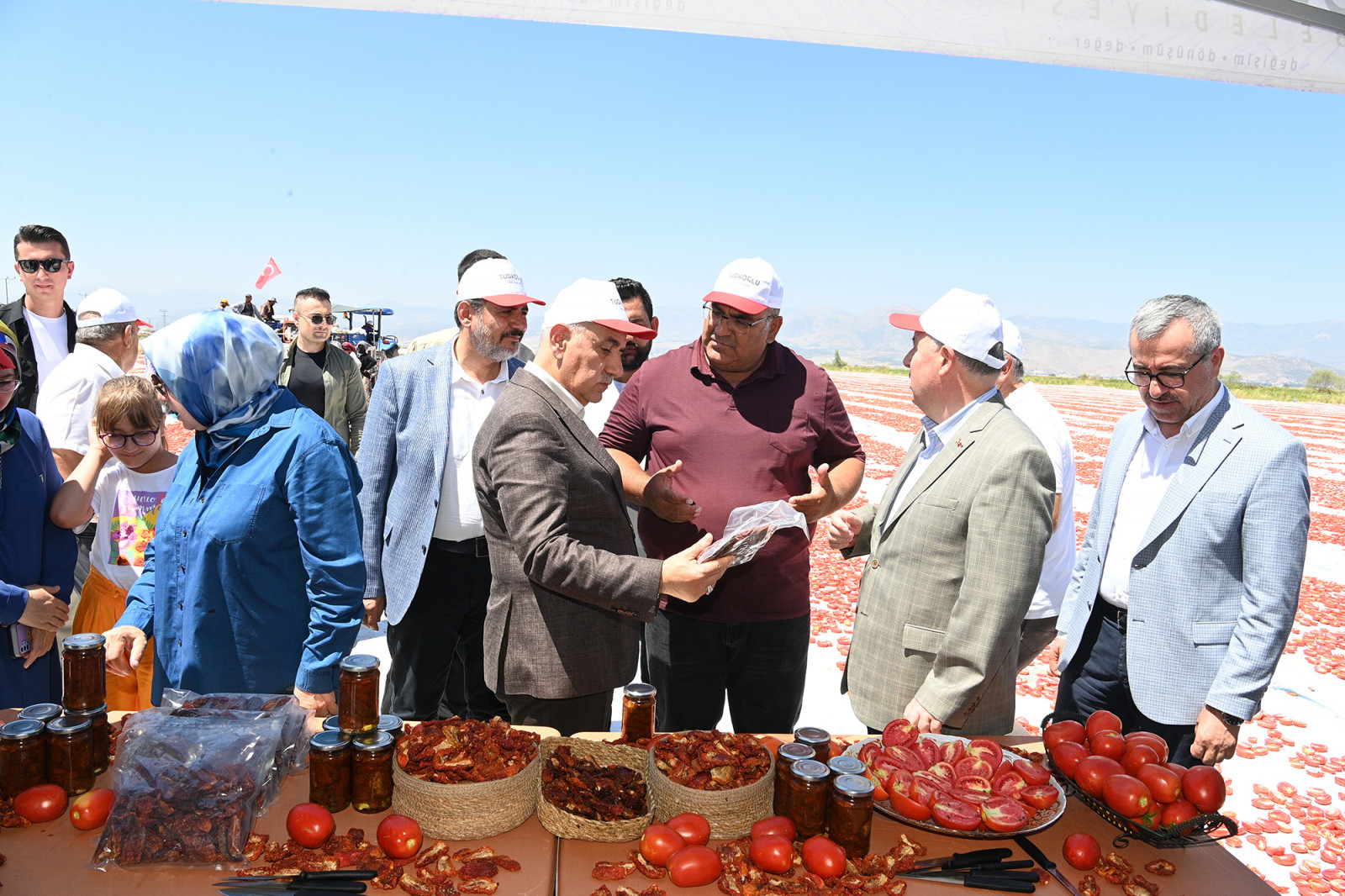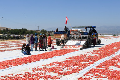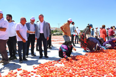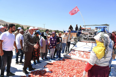 Kahramanmaraş Büyükşehir Belediye Başkanı Hayrettin Güngör, TBMM Tarım, Orman ve Köyişleri Komisyonu Başkanı Prof. Dr. Vahit Kirişci ile Türkoğlu ilçesi Çobantepe Mahallesi’nde gerçekleştirilen ‘Hasat Edilen Domatesin Kurutulup İhracata Hazır Hale Getirilmesi’ programına katıldı. Vali Ömer Faruk Coşkun, AK Parti Kahramanmaraş Milletvekili Ömer Oruç Bilal Debgici, Türkoğlu Belediye Başkanı Osman Okumuş ve AK Parti İl Başkanı Fırat Görgel’in de yer aldığı programda heyet, üretici ve tarım işçileriyle de bir araya geldi. Programın açılış konuşmasını yapan üretici Ökkeş Kaçar, Türkoğlu’nda üretilerek kurutulan domateslerin 40 ülkeye ihraç edildiğini belirtti. Türkoğlu Belediye Başkanı Osman Okumuş, “Hedefimiz; Türkoğlu’nun bu verimli topraklarında katma değeri yüksek ürünler üreterek çiftçimizin daha fazla gelir elde etmesini sağlamak” diye konuştu.